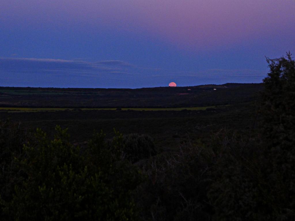 La subida al Tozal de Guara se puede afrontar desde varias vías. Por la cara sur una de estas vías es desde el pueblo de Santa Cilia. Un recorrido sencillo, bien señalizado, pero con bastante desnivel. Pasando por el mismo pueblo se puede seguir en coche algo más de un kilómetro por una pista en buen estado hasta un cartel que indica la prohibición del paso de vehículos. Llego justamente cuando la enorme luna llena que había esa noche se está ocultando por el horizonte.