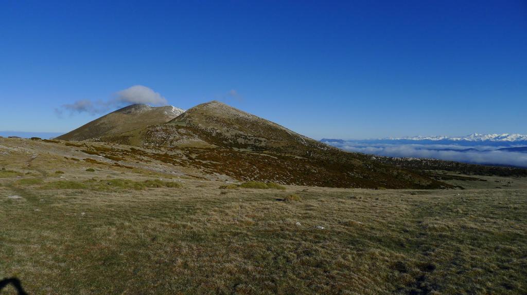 Desde el collado se gira a la izquierda y se inicia un recorrido largo con zonas llanas y algo de sube y baja. Se suceden zonas de pasto y zonas pedregosas. Se sigue más o menos la cresta, la senda está más difusa, con visibilidad no hay ningún problema, pero en caso de niebla puede ser delicado porque son unos lomos muy poco marcados. La punta de Guara se puede ver, pero alcanzarla cuesta todavía un rato. Durante toda la cresta el viento azota bastante fuerte. En la parte final hay nieve formando cornisa hacia la cara norte. También la vista hacia la hoya de Huesca es bonita, con una extensión de campos de cultivo que ahora están de un verde intenso por las últimas lluvias.