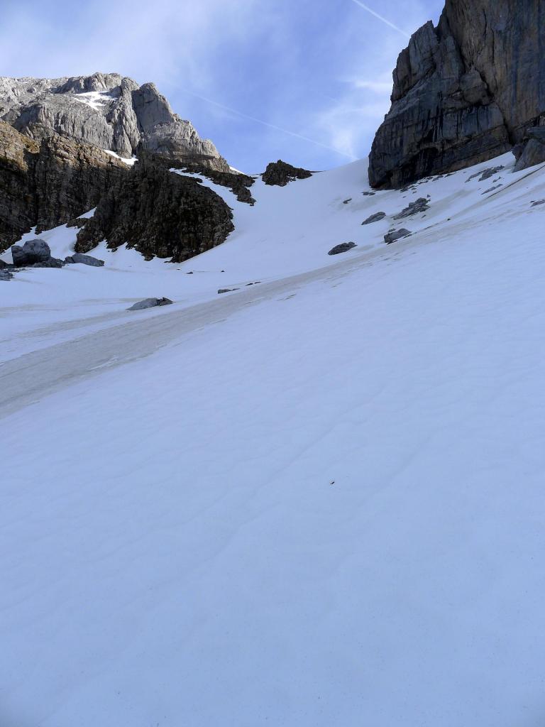 En esta zona llana intento atajar hacia mi derecha por la ladera de nieve para alcanzar el camino que se dirige, rodeandolo, al llena de la Garganta, pero me encuentro con nieve muy dura y con mucha pendiente, así que, pensando todavía en atacar este pico, vuelvo al fondo de valle para, por la ruta normal, continuar hasta el paso de Napazal. Dicho paso (2329m.) se alcanza fácilmente por este lado sur, pero por el norte es un impresionante corredor que incluso en verano resulta muy incómodo porque es una pedrera inestable, estrecha y muy pendiente. A la derecha (SE) sale una senda a media ladera que va rodeando las murallas del Llena de la Garganta, la sigo hasta que obliga a atravesar un gran nevero, me lo pienso dos veces y decido volver a intentarlo en otra ocasión, cambiando mi objetivo por el Llena del Bozo.