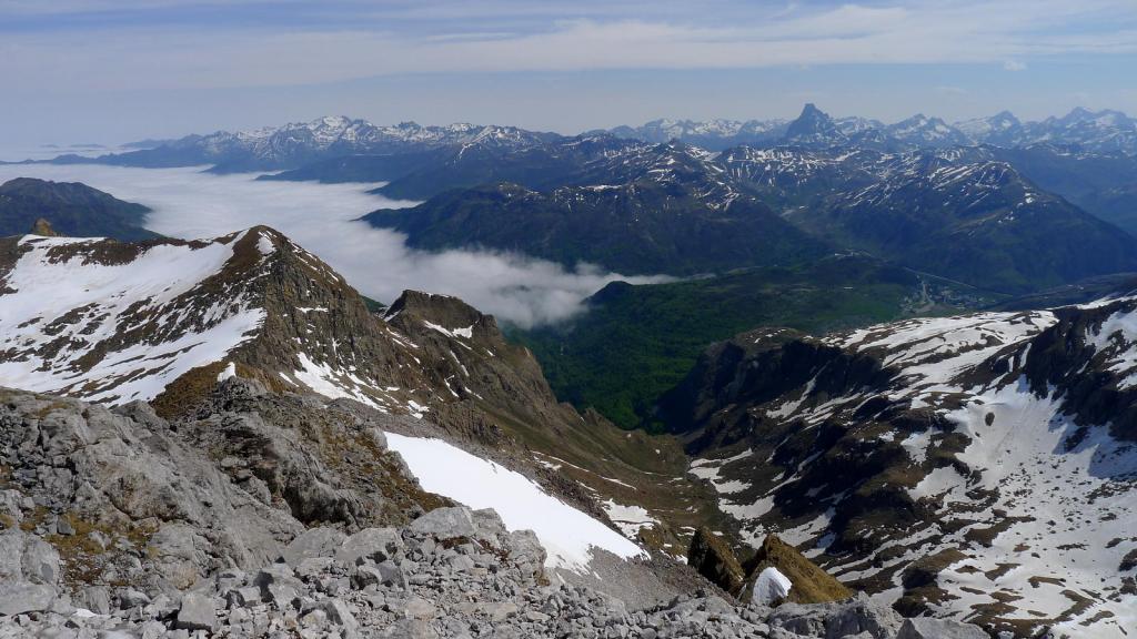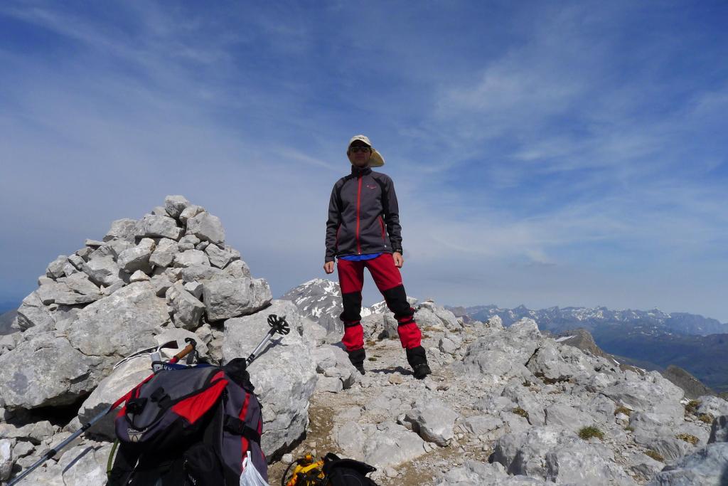 Vuelvo, por tanto, al paso de Napazal y busco la travesía hacia la izquierda (oeste), llegando hasta las murallas que protegen la ladera final del pico. Buscando los pasos entre neveros y chimeneas de rocas que hay que escalar con algo de cuidado (Iº y Iº+) para llegar a la ladera sur del pico y alcanzar la cumbre.