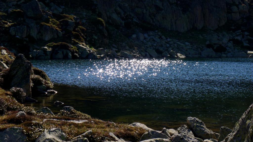 A 2410m., tras 1h 45′ de caminar, llegamos a una praderita preciosa donde se encuentra el refugio de Ensangents. Aquí ya nos hemos librado de los insectos e iniciamos una subida un poco más fuerte hacia los lagos de Ensangents. Son tres lagos entre 2530 y 2550m., el mayor es el lago superior. Hacemos una parada en el lago intermedio (2h 45′) para reponer un poco las fuerzas.