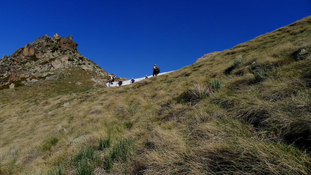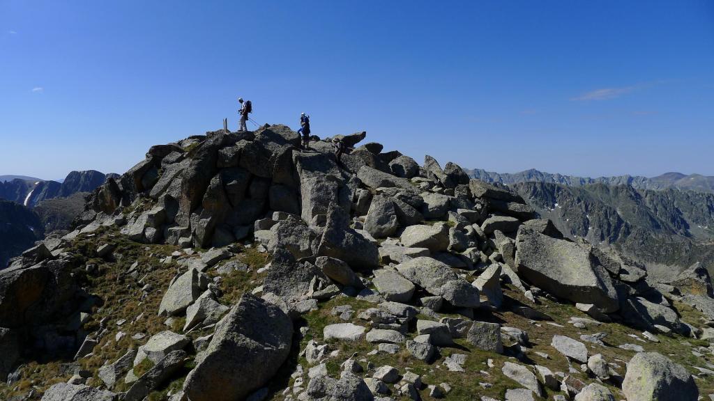 Desde el lago superior se ve calaramente la pendiente de hierba hasta la collada d’Entinyola (2663m. 3h 09′), que se supera por una sendita y conserva un buen bloque de nieve. A nuestra derecha (este) se eleva el Alt del Griu. No encaramos directamente el lomo oeste del pico, sino que rodeamos un poco hacia el norte desde el collado subiendo por la ladera oeste-noroeste. La parte final es muy suave y la cima está constituída por dos conjuntos de grandes bloques graníticos, siendo el conjunto del sur un poco más elevado. Alt del Griu 2874m 3h37′.