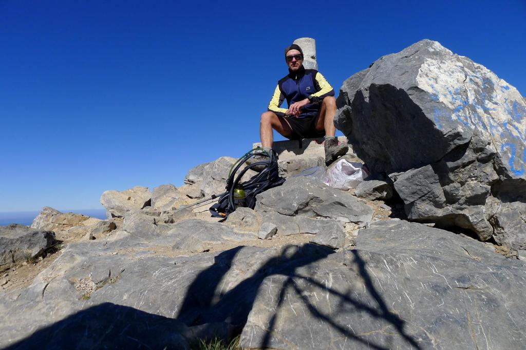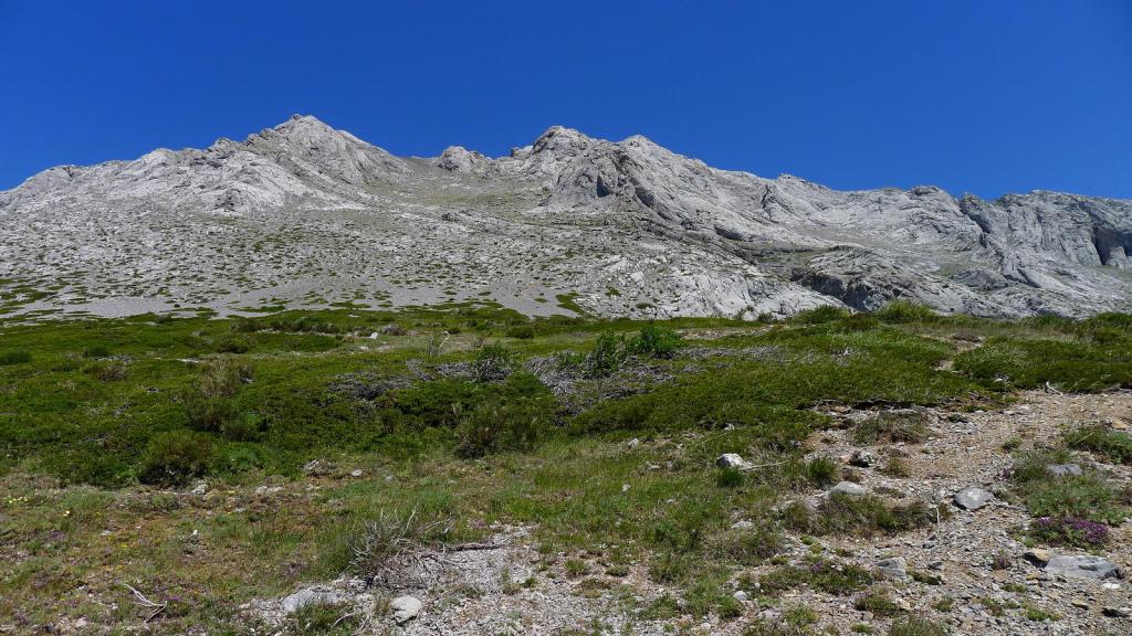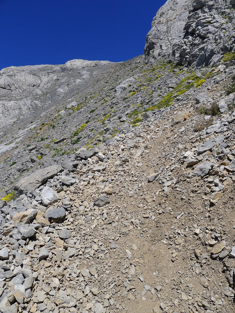 La primera parte es una ladera con vegetación; trato de seguir alguna traza de senda, pero apenas se vislumbra. Ataco la pedrera más o menos por el centro, encuentro algún hito de vez en cuando y zonas un poco pisadas, pero suelo seguir intuitivamente por los sitios más cómodos. En ningún momento hay una pendiente excesiva, por lo que, aunque hay mucha piedra suelta, tampoco presenta mayores problemas. En la parte final, con más pendiente, me voy pegando a la pared rocosa de mi derecha, por donde encuentro paso más cómodo y senda un poco más marcada hasta llegar al collado (2404m). Desde el collado una corta y fácil cresta conduce a la cima (Espigüete 2451m 2h30’)
