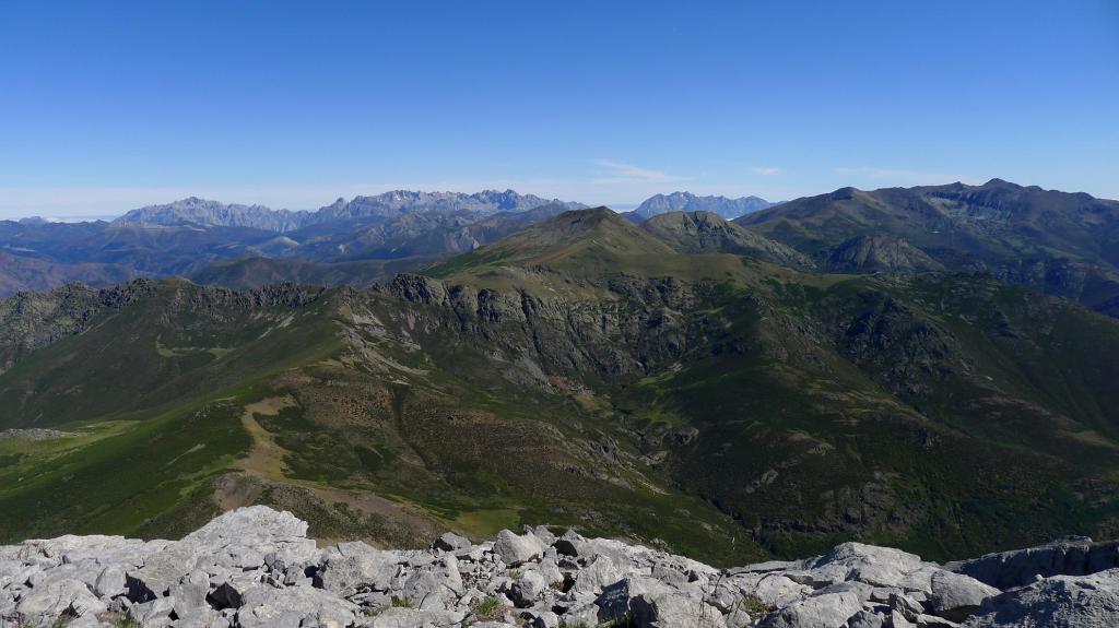 Además de la imponente panorámica de los Picos de Europa, desde la cima observo el recorrido que tenía pensado hacia el pico Murcia, aunque lo veo demasiado lejos al norte. Sin embargo como es buena hora comienzo a seguir la cresta hacia el oeste. Enseguida me doy cuenta de que cuando la cresta gira hacia el norte comienza un vertiginoso descenso rocoso para acceder a los herbosos collados de Arra, casi 400 m. más abajo. Demasiado complicado, decido volver a la cima y hacer la cresta en sentido contrario hasta la Punta Este (2443m 3h34′) que es fácil y solo tiene un paso que podría considerar como I+. Desde aquí hay una mejor vista del Curavacas.