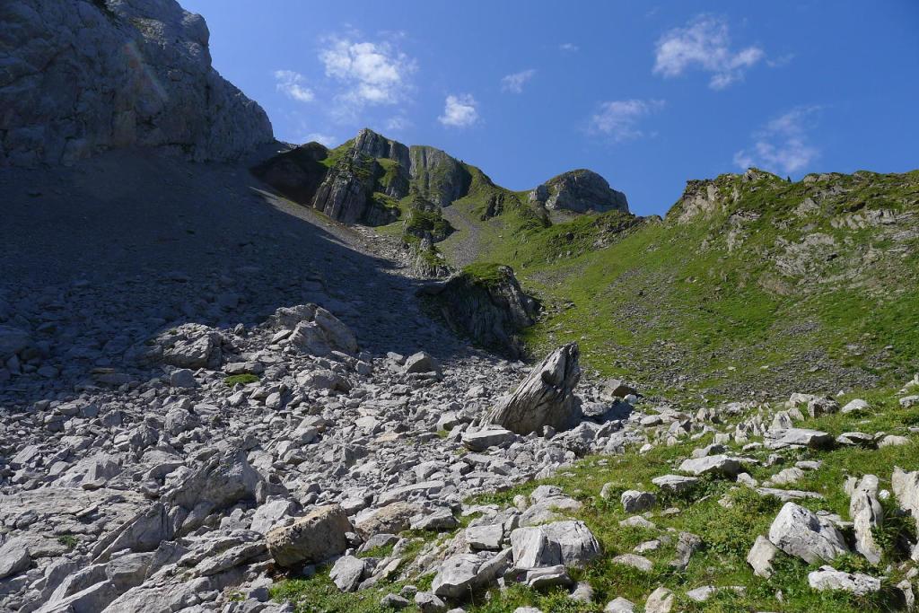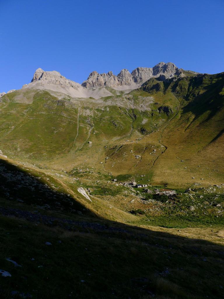 Al salir al valle abierto estamos cerca de la cabaña de pastores les Cayolars d’Anaye, aunque no se puede ver todavía, pero hay que desviarse hacia la izquierda (sur) del camino principal antes de las cabañas (1477m)para iniciar la auténtica ascensión al Billare. La senda tiene una traza muy tenue pero hay algunos hitos. Bajo la potente pared del Petit Billare hay una gran pedrera que habrá que evitar siempre, para ascender por la zona herbosa de su derecha. A veces se verá una clara senda por la pedrera, pero será mucho más cómodo avanzar por hierba aunque la huella se nos despiste un poco, si seguimos paralelos a la pedrera volveremos a encontrar la senda clara.