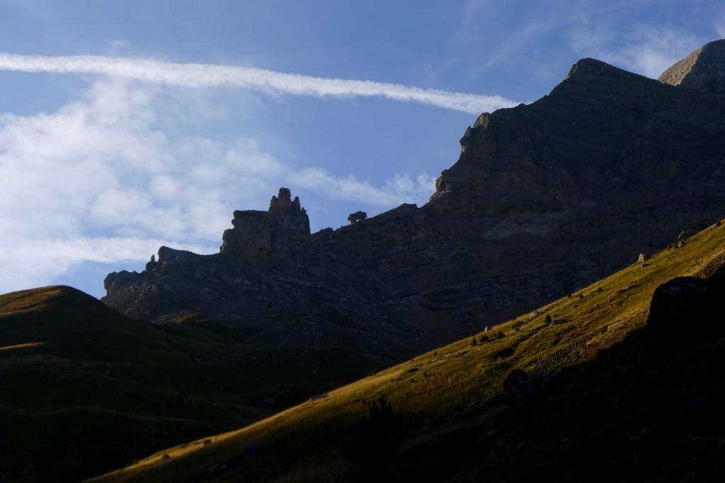 En principio no tenía intención de entretenerme en la cumbre porque me han acompañado unos nubarrones inquietantes durante la ascensión, pero parece que ahora se dispersan y como tranquilamente antes de empezar el descenso. Tengo que destacar que en esta excursión se me cruza uno de los rebaños de sarrios más grandes que he visto nunca, una pareja de quebrantahuesos y una pareja de alimoches. Realizo el descenso por el mismo camino para llegar al puente de los Peregrinos de Canfranc (1205m 8h16′)
