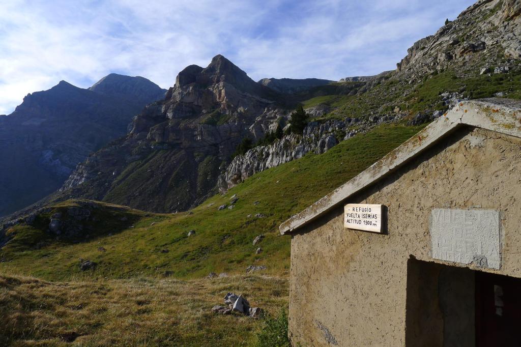 Se inicia un nuevo tramo por un sendero que , ahora sí, asciende decididamente hacia el S y SW mediante un zigzag que se dirige a una muralla rocosa, que será superada girando hacia la derecha por debajo de dicha muralla para llegar hasta un hombro donde se sitúa la cabaña de la Vuelta de Iserías (2h06’ 1905m)
