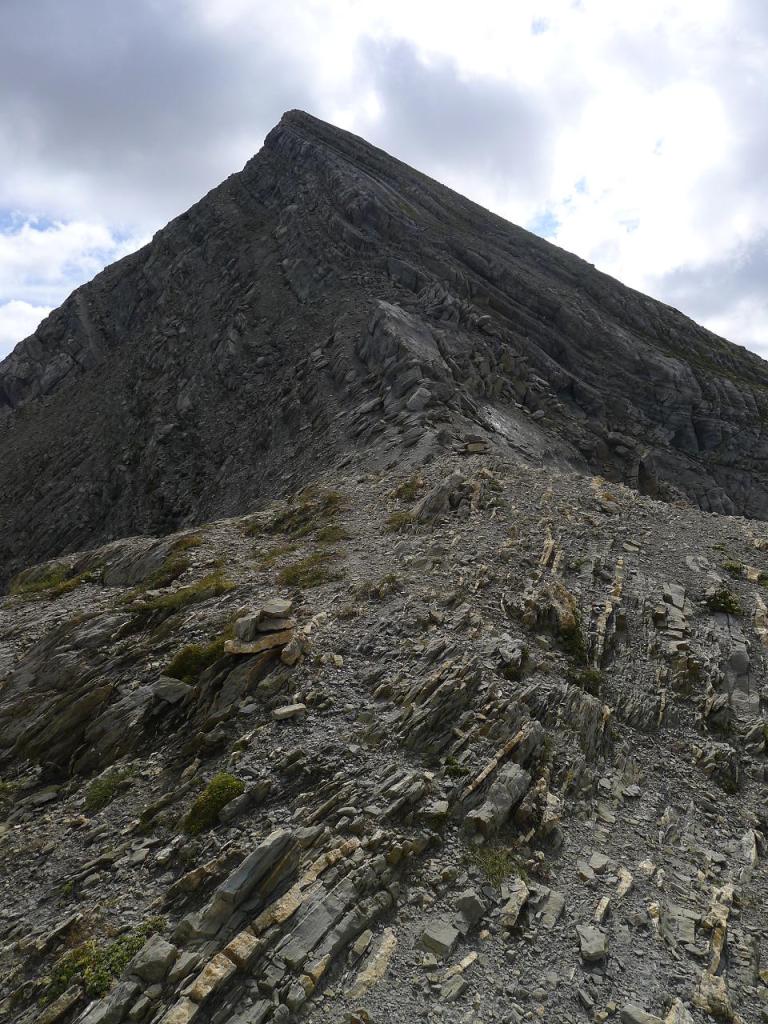 Se toma la cresta hacia la izquierda (E), pero enseguida nos vamos desviando por la ladera sur, algo herbosa, por la que se avanza un rato para finalmente ascender otra vez a la cresta rocosa y un poco aérea pero fácil y llegar a una primera cima (Cota 2775m) y luego a una segunda (2783), que compruebo en el mapa que es la más alta, aunque a simple vista no puedo distinguir (cima Pala de Ip 2783m 4h14’)