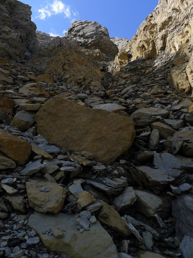 La canal es de piedra suelta e incómoda, pero tiene menos pendiente de la que me esperaba, supera unos 120 o 130 m. de desnivel y prácticamente no hay que echar las manos en ningún momento, sin embargo a dos montañeros que me encuentro cuando yo ya estoy descendiendo les parece bastante complicada. (Collado 3h45’ 2622m)
