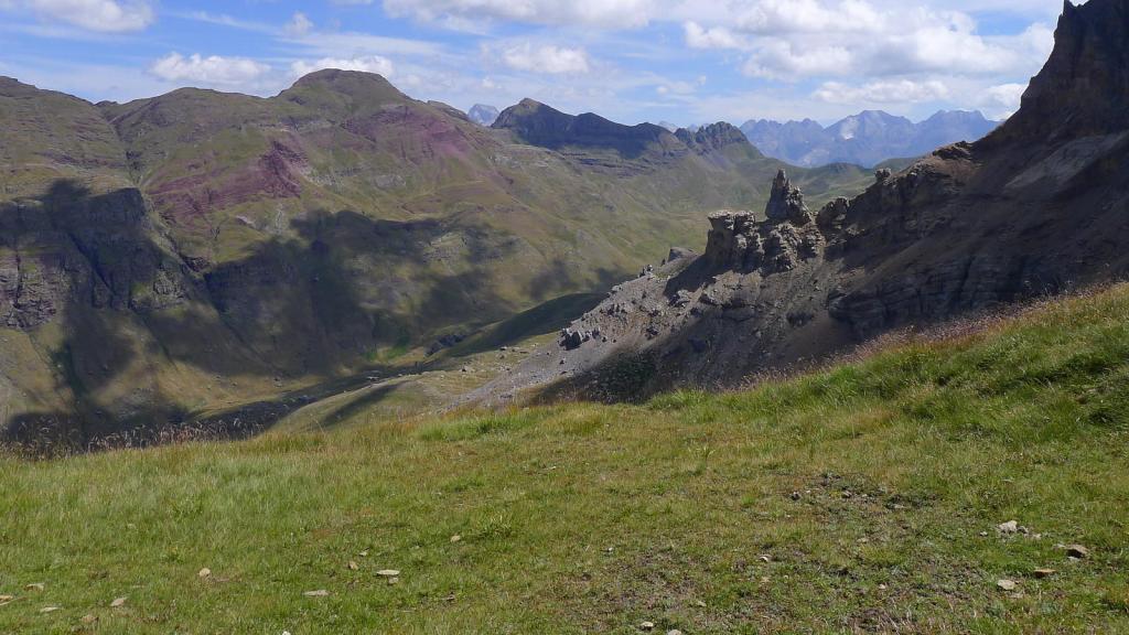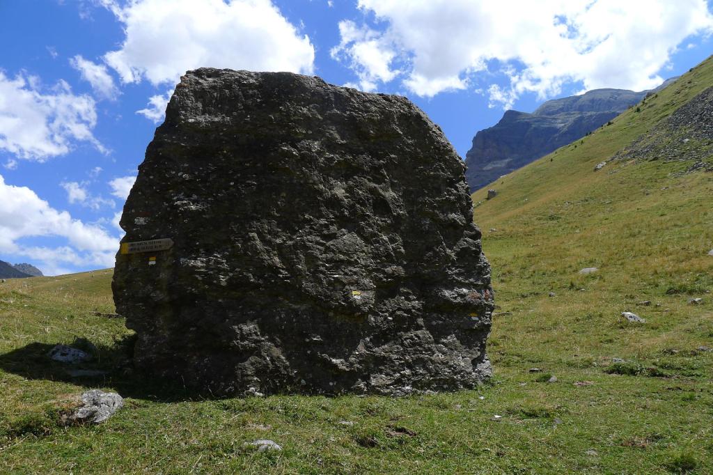 El GR nos va introduciendo en el Valle de Izas (disfrutemos de este valle antes de que lo destrocen entre las pistas de esquí de Formigal y Candanchú), un tramo de senda que sube y baja y apenas permite ganar desnivel. Al cabo de un rato el valle se abre y se puede ver en toda su amplitud, un precioso valle cubierto de pastos, avanzando por el GR hasta encontrar un monolito de piedra de unos 5 m. de alto que surge sobre la pradera y que indica la desviación a la derecha de un PR (señal amarilla y blanca) que va al ibón de Iserías (Desviación 1h20’ 1630m.)