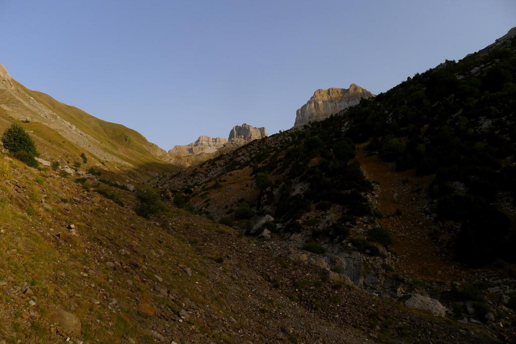 La sierra de la Partacúa discurre de W a E cayendo sobre la margen derecha del valle de Tena. Los puntos culminantes son la Peña Telera y Retona. Hacia el N sus paredes caen a pico sobre el valle de Piedrafita, mientras que hacia el S se abren valles más suaves como el del barranco del Puerto de Biescas. La ruta que he escogido es precisamente esta última, un acceso sin dificultades salvo por la distancia y el desnivel, que hacen que sea poco frecuentada, de hecho no encuentro a nadie durante toda la ascensión, solo 8 montañeros que están en la cumbre cuando yo llego y que han pasado la noche en el refugio de Usabas.