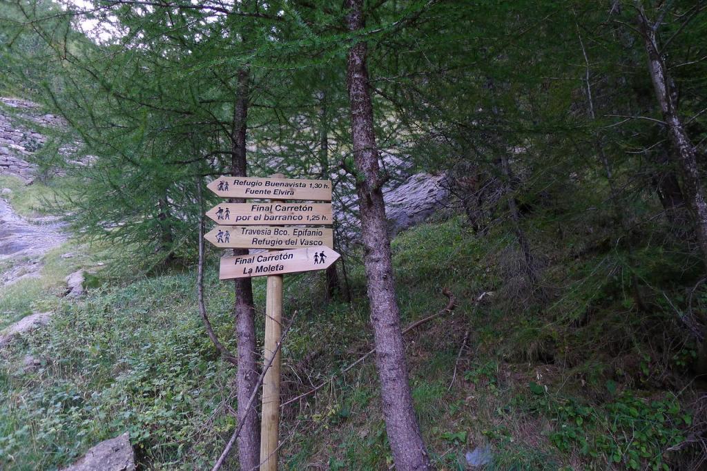 Se comineza justo antes de entrar en Canfranc, pasando un puente a la derecha de la carretera donde se encuentra una central eléctrica (Central eléctrica 1180m). Allí se inicia una pista por la que se pueden hacer suaves paseos en torno a Canfranc, pero yo dejo la pista para subir por un sendero señalizado a la derecha (inicio del sendero 1228m. 0h07′).