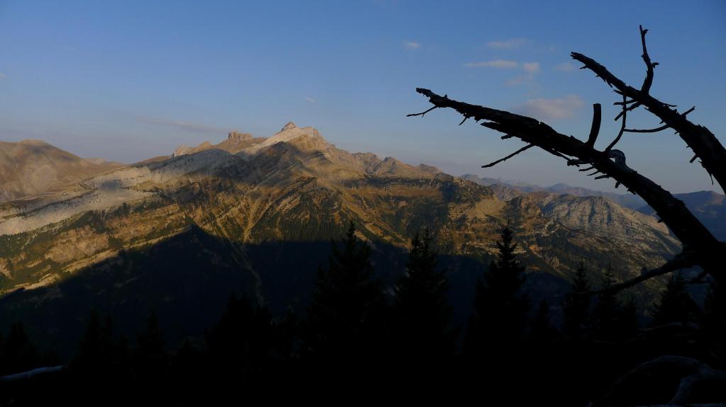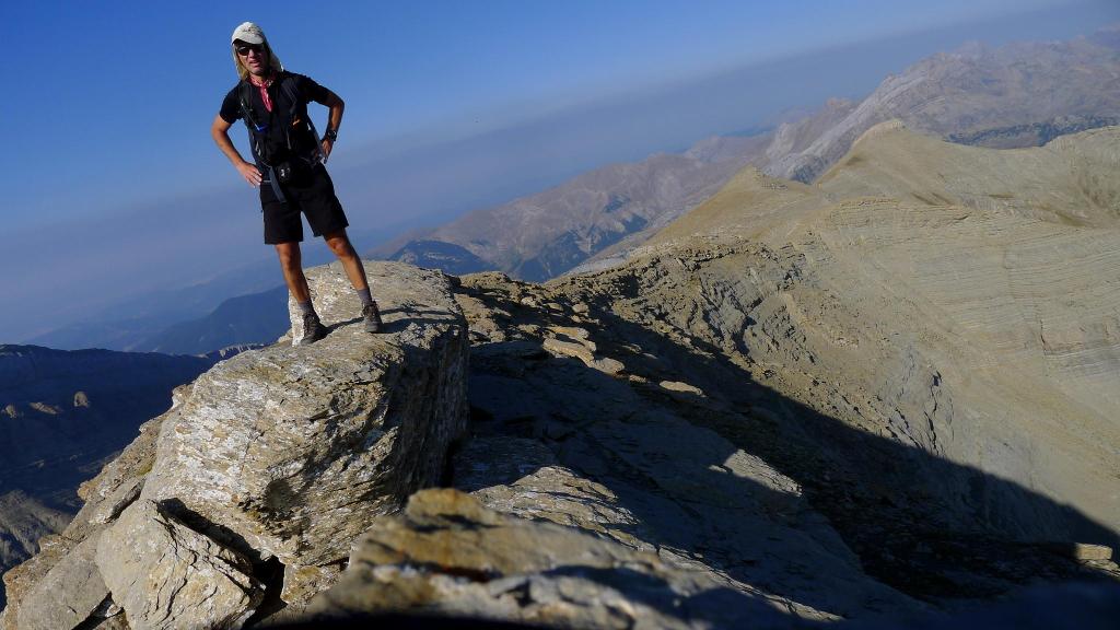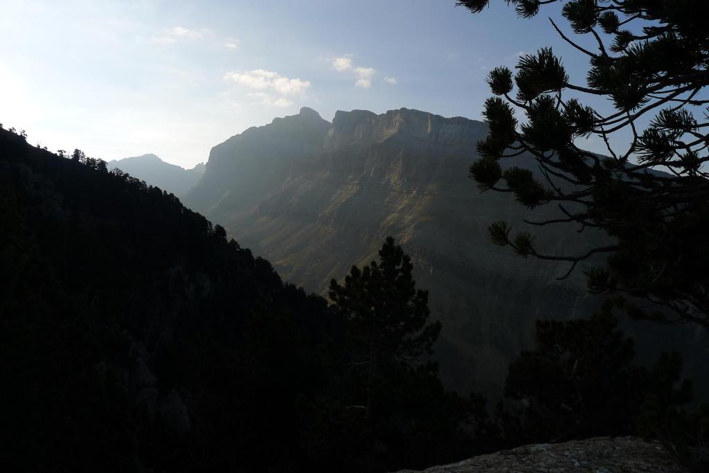 Por fin, hacia 1900m el bosque se abre un poco y nos encontramos unas gradas rocosas que se superan siguiendo las marcas del PR y nos conducen a la cresta del espolón del monte Larrón; desde allí se puede uno asomar a la vertiginosa caída sobre el valle de Ip y ver la cara norte del pico Collarada (cresta del monte Larrón 2015m 1h30′). Poco después se cruza la pista que viene del embalse de Ip y nuestra senda continua señalizada en dirección NE.