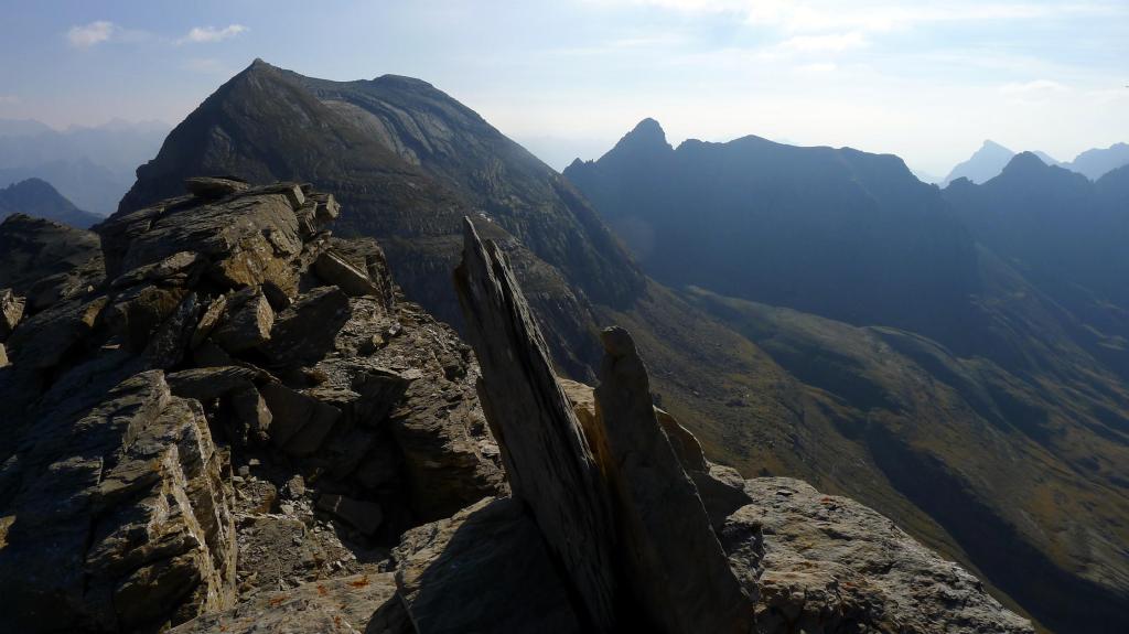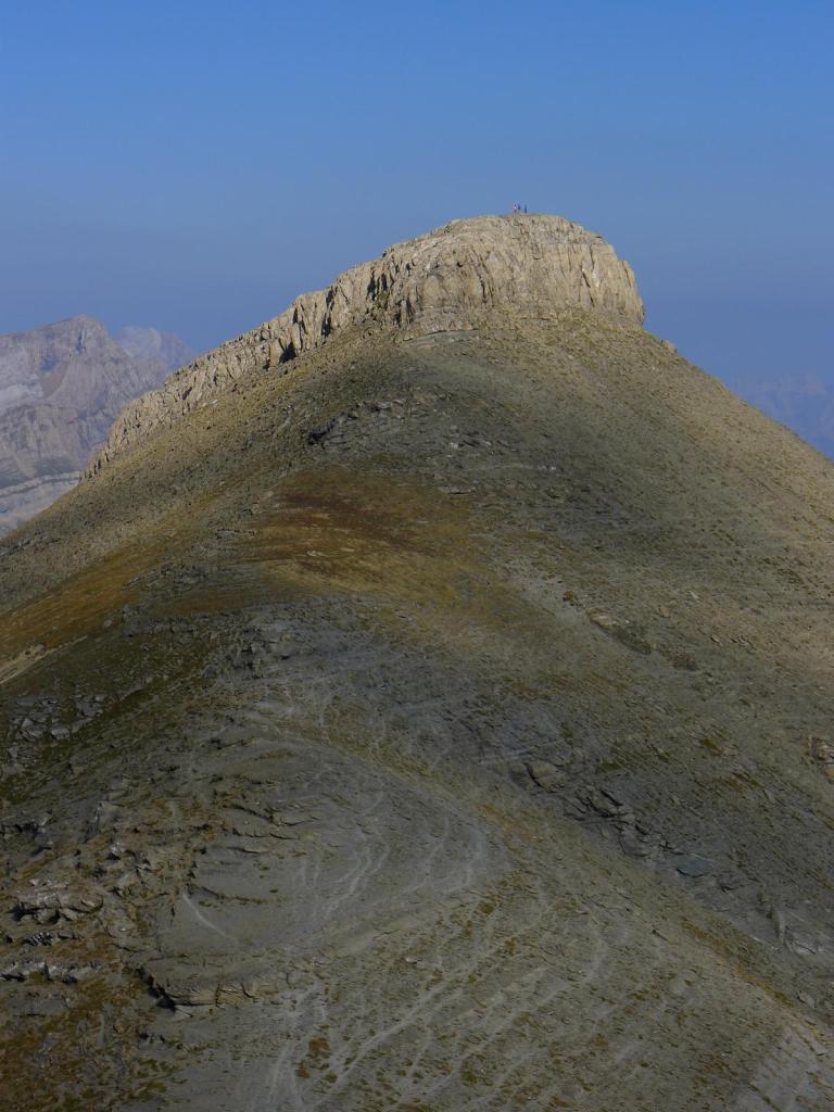Mi plan es continuar por la cresta de la Tronquera, así que desciendo en dirección ESE, por unos pasos también fáciles por la pared de la Moleta, y luego por una amplia cresta hasta un collado situado sobre el ibón de Samán o Iserías (collado 2519m. 2h32′). Desde alli se asciende una cota intermedia (cota 2613m. 2h43′), desiciendo un nuevo collado y evito otra cota por la derecha (S), cota que se alarga en un espolón hacia el norte formando el circo de Samán, (la ladera de Ip al S es mucho menos abrupta que la de Izas), para ascender el punto culminante del día que es el pico de la Tronquera (pico de la Tronquera 2693m. 3h00′), que es el pico anterior a la Pala de Ip, que ya subí en agosto.