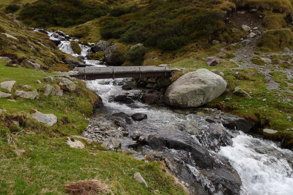 Pasando a terreno abierto y siempre por la orilla derecha del río habrá que cruzarlo a la margen izquierda. Pensé que podría ser problemático por el abundante caudal, pero veo con alivio que hay una pasarela (Puente 1710m 1h04′)