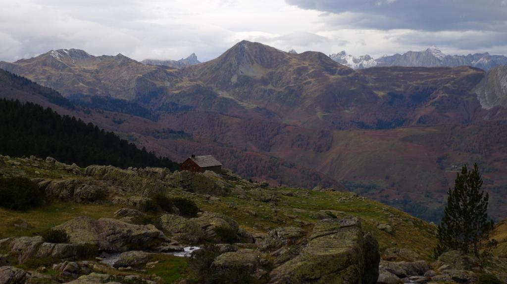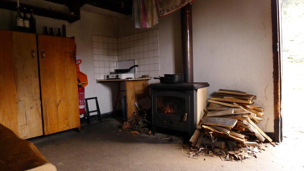 Nada más atravesar el río hay unas cabañas de pastores y un poquito más arriba encuentro el acogedor refugio de Larry. La sala que está abierta tiene una estufa de leña encendida, cocina de gas, un armario con algunos suministros, una litera, mesa y bancos y, en un altillo, más plazas para dormir, con mantas. Según leo en una guía para pernoctar hay que pedir permiso en Urdos o Bedous; a mi me sirve para hacer un descanso y comer algo en un sitio caliente (refugio de Larry 1736m 1h.40′)