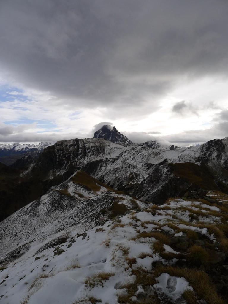 El tiempo en la cima no está como para entretenerse mucho, solo para hacer unas fotos y apreciar la amenazante y negra mole del Midi d’Ossau por detrás del pic d’Ayous. El cielo está cada vez más oscuro y prefiero descender lo antes posible para no mojarme.