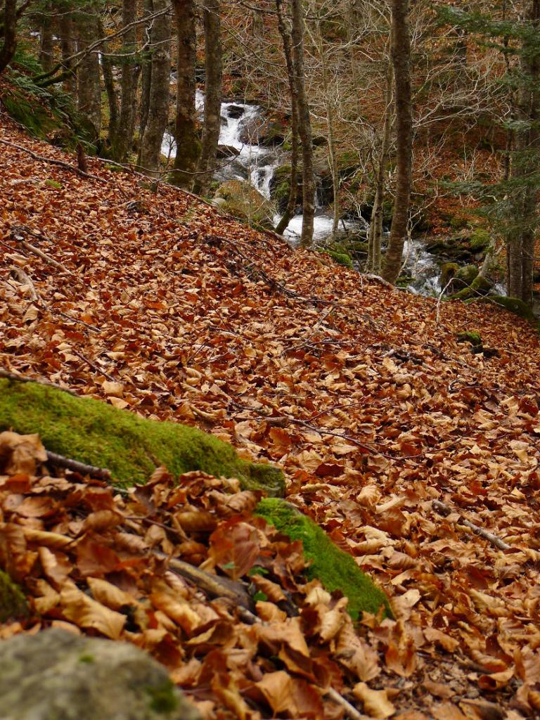 A 1320m hay que tener cuidado de girar a la izquierda, alejándonos un poco del barranco de Larry para zigzaguear evitando un lomo boscoso y volver luego cerca del río. Nos meteremos de nuevo en pleno hayedo por un fantástico camino alfombrado de hojas de hayas.