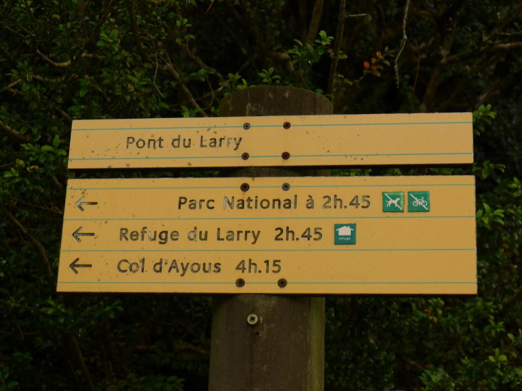 Salgo desde la carretera de Somport a Urdos. A 1.5km. al S de Urdos hay un puentecito, en la orilla derecha del barranco sale una pista y en su orilla izquierda sale una senda señalizada con carteles (Pont de Larry-refugio de Larry-col de Ayous) y hay un pequeño espacio para aparcar. (Cartel de inicio de la senda 850m 0h00′)