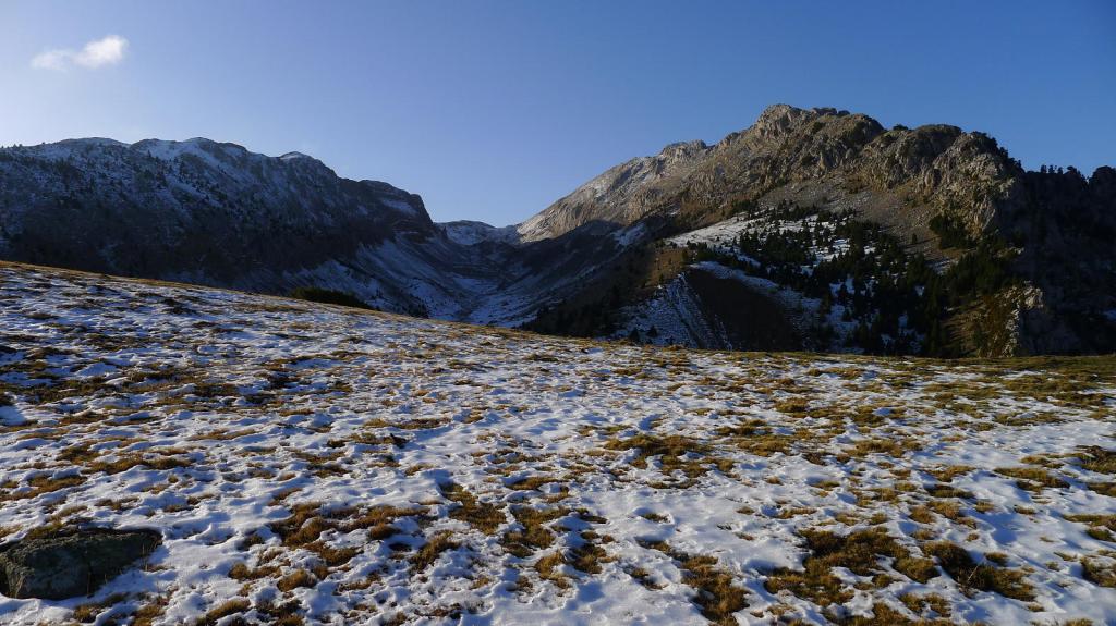 La pista asciende por un poblado bosque de pinos . En un momento nos equivocamos al no tomar una desviación a la derecha que parecía una senda secundaria, pero que en realidad es el camino que debíamos tomar (Desviación 1645m 0h40′). El camino se empina cada vez más hasta salir a terreno despejado más llano, donde se desdibuja el sendero, pero se ve que tenemos que superar un lomo que nos asoma por fin a la Coma de San Adrián (Collado de la Montañeta 1915m). Si nos volvemos hacia el N. ya tenemos unas buenas vistas de los Eristes, Posets y el Gallinero de Cerler.