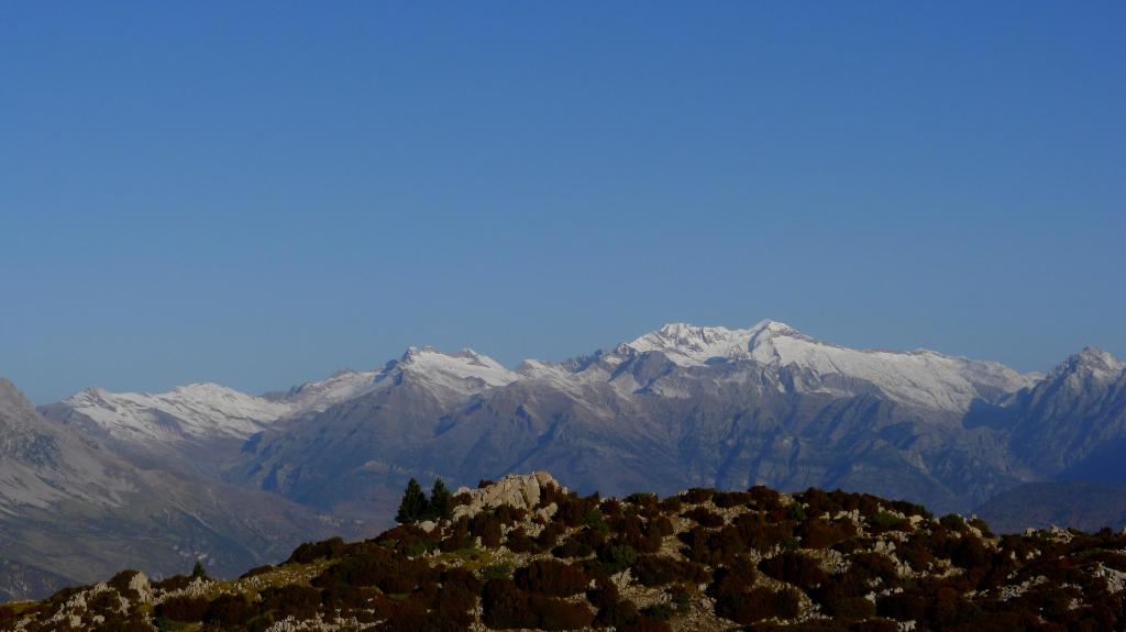 Descendemos por la senda balizada, nos metemos por una canaleta y después por bosque de pinos para llegar al siguiente collado, las Colladas (Las Colladas 1910m 5h30′). También hay un cartel indicador, la dirección Espés-Abella desciende directamente por el valle NNE hasta la ermita de las Aras (Ermita de las Aras 1740m. 5h50′.) La ermita está completamente rehabilitada en un llano herboso, donde confluye también el PR-HU-133 desde las Vilas del Turbón hasta Abella por el puerto de las Aras, con señalización blanca y amarilla. Así que ahora seguimos una pista balizada con blanco, verde y amarillo, dejamos la desviación a Espés a la derecha y seguimos dirección Abella, hasta desembocar en la pista principal. Ahora el PR sigue de frente hacia Abella y nosotros nos vamos por la pista a la izquierda para llegar al coche (Selva Plana 6h.40′)