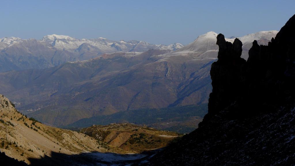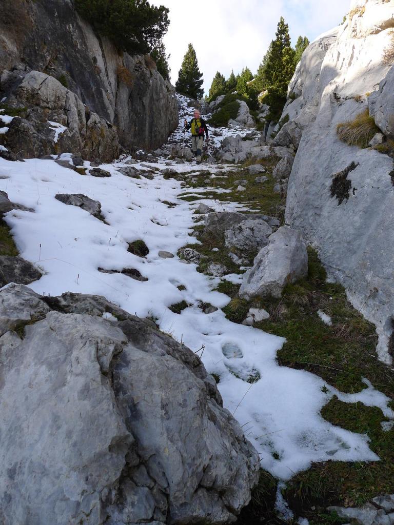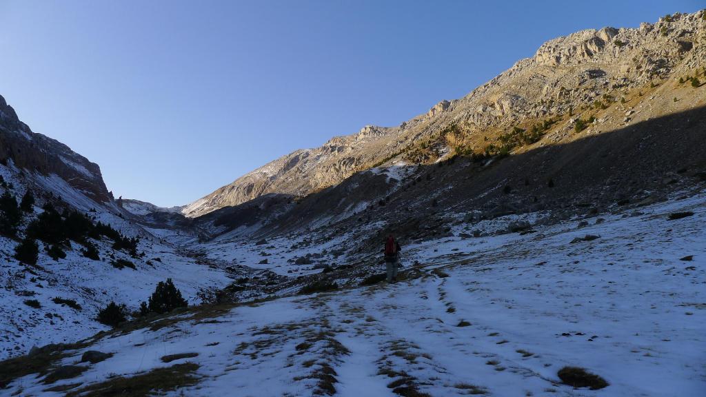 Las paredes de la cara W son vertiginosas e inaccesibles, excepto por una canal un poco más abierta, muy cerca de la cima del macizo y que se convierte en una de sus vías normales, la que asciende desde el refugio de la Plana. Pero también al SE hay unas murallas impresionantes. La otra vía normal que realizamos en esta ocasión Ramón Monedero y yo es la que discurre por el fondo de la Coma de San Adrián que he nombrado antes.