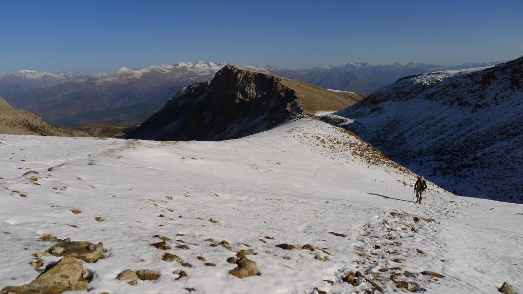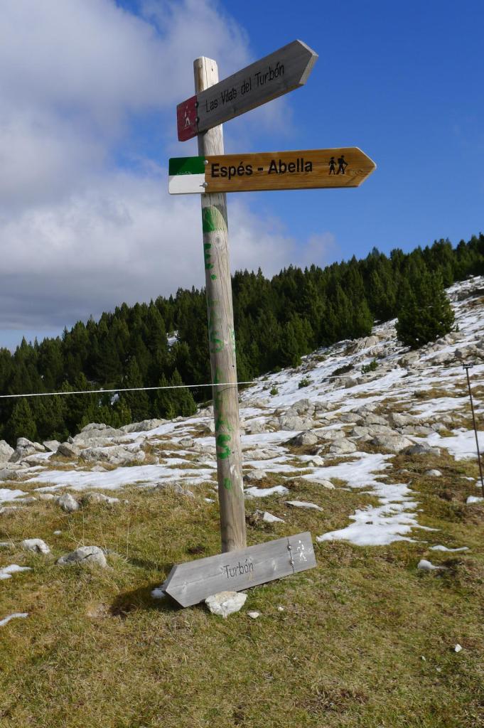 Después de media hora en la cumbre empezamos el descenso por la misma ruta hasta el collado Porroduno, desde el que seguimos la dirección de las Vilas del Turbón. Caminamos por la pedregosa ladera E del Turbón entre 2300 y 2250m, siguiendo hitos y trazas poco claras de senda, a media altura entre la cresta de la Coma de San Adrián y un cortado a nuestra derecha que cae hacia el valle de las Vilas del Turbón, hasta que dejamos atrás dicho cortado y podemos ir girando a la derecha por un suave lomo (dirección SE) que desemboca en un collado. Es el collado de Pasaturdiello y tiene un cartel indicador, a la derecha las Vilas del Turbón, recto Espés-Abella por un PR con señal verde y blanca, es el camino que seguimos (collado de Pasaturdiello 2020m 5h10′)