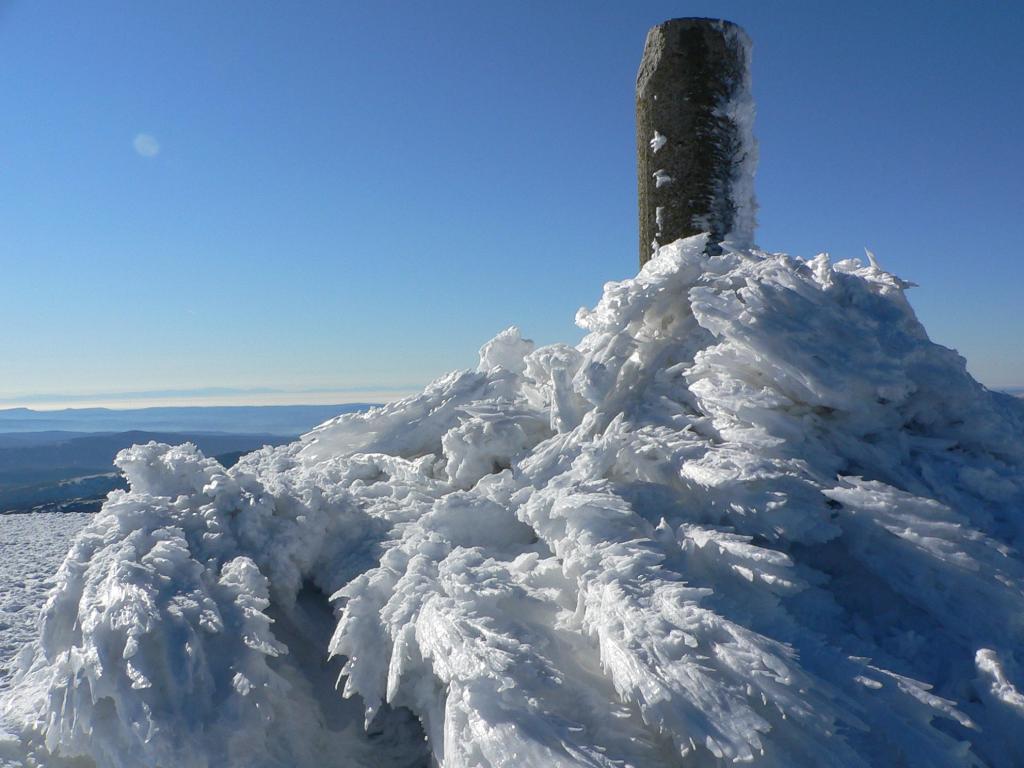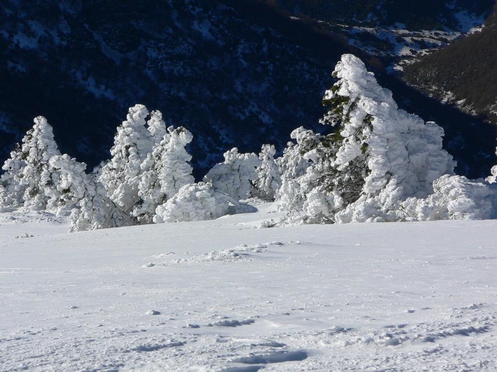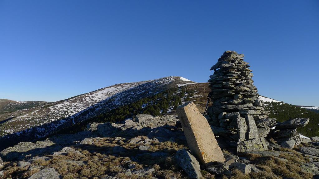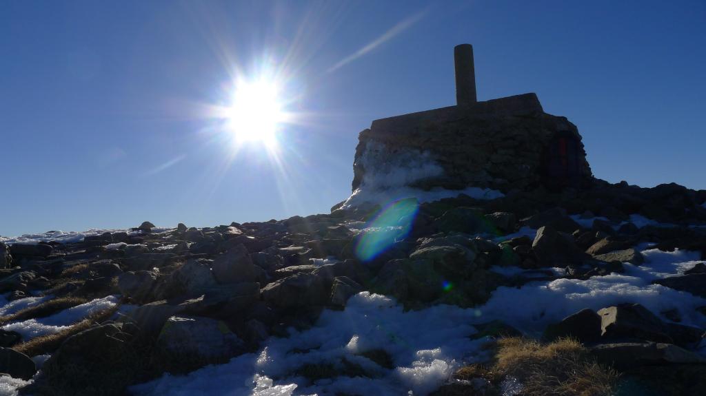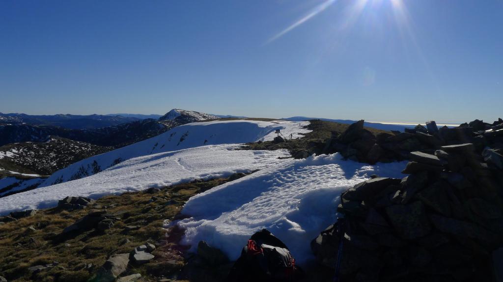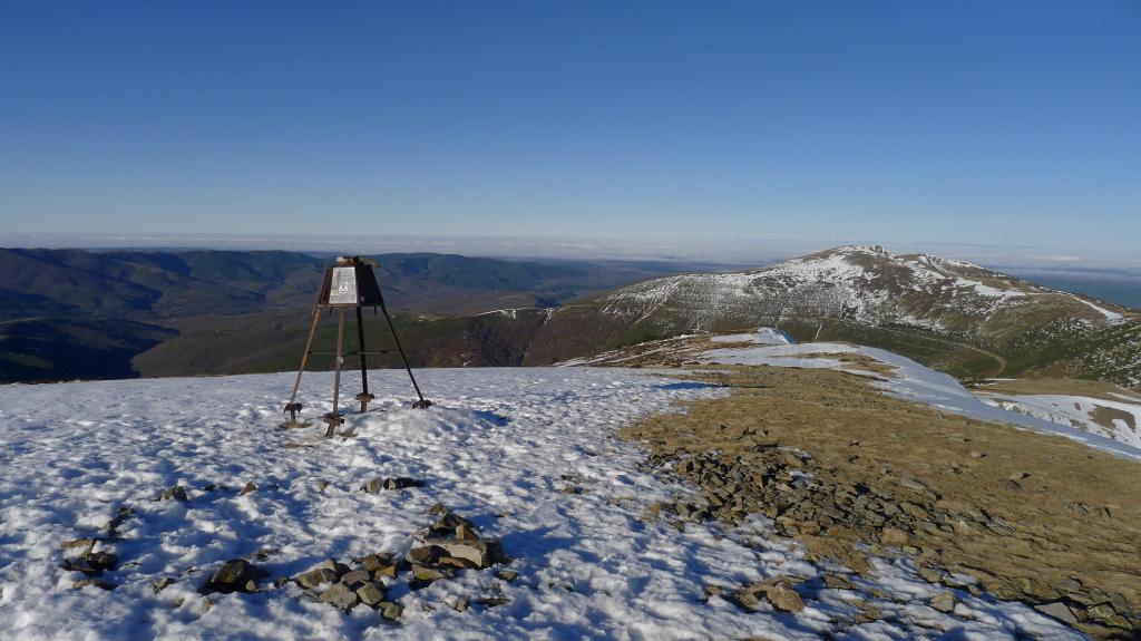 Hay muy poca nieve en esta ocasión, apenas hay que pisar una poca justo al llegar a la cumbre, llena de Belenes montañeros (San Millán 2131m 2h20′). Un fuerte viento azota la cima, pero viene más bien del S y no es muy frío. En general el día es bastante caluroso.