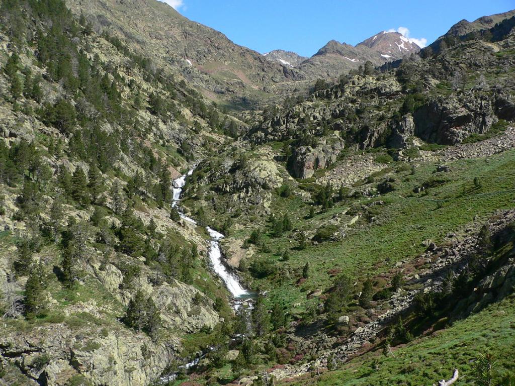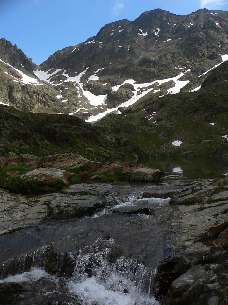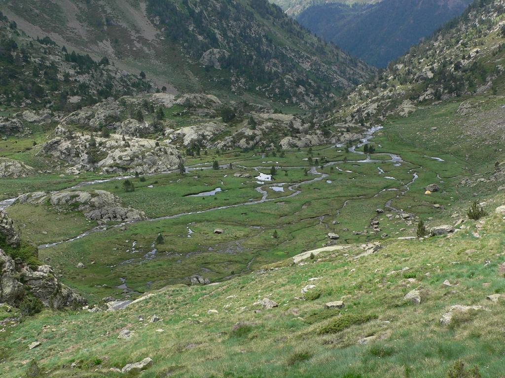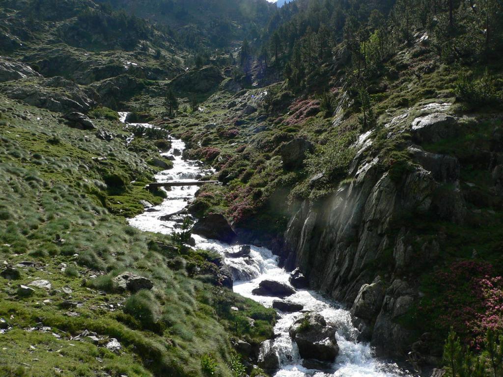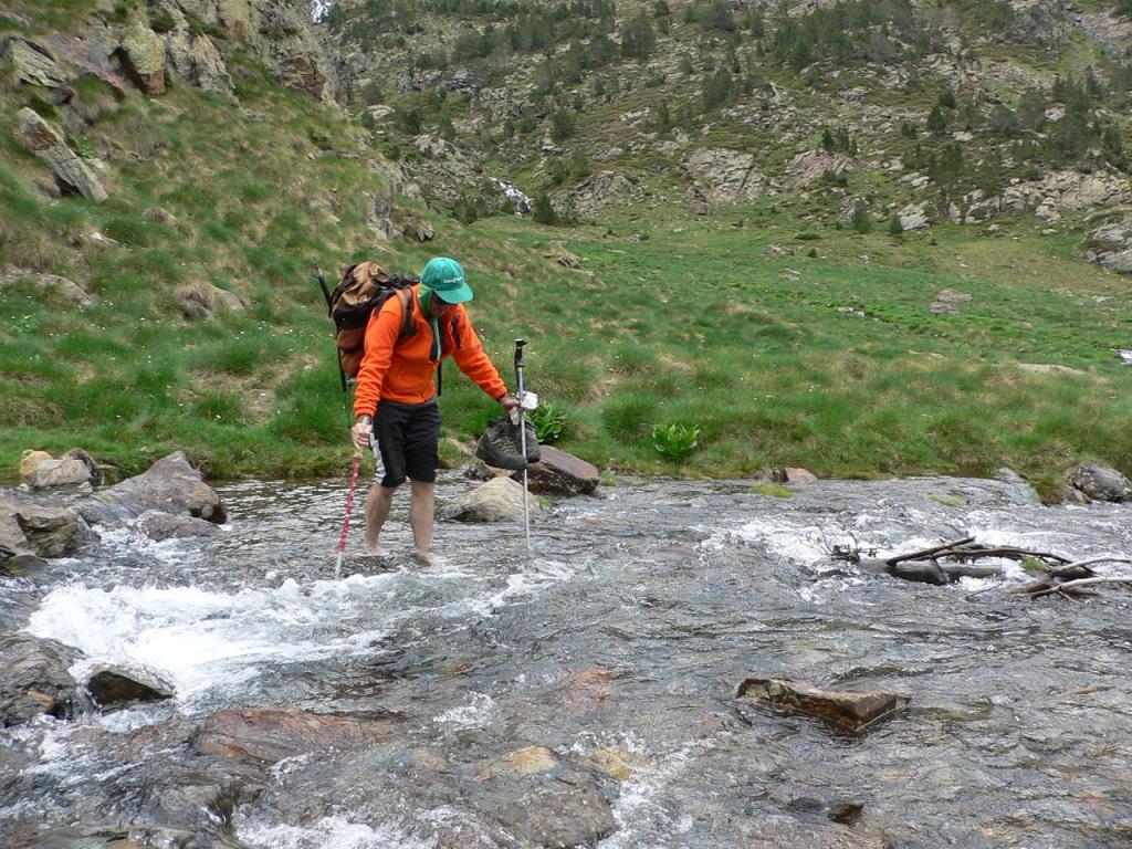 Ahora ya se sigue claramente por el fondo del valle de Sotllo, junto al barranco por su orilla derecha, hasta llegar a Plans de Sotllo, una zona llana donde tenemos que dejar el camino que sube al puerto de Sotllo y la Pica d’Estats para cruzar el barranco a su orilla izquierda y dirigirnos hacia el E. (Plans de Sotllo 2190m). Aquí no hay puente y debemos descalzarnos y cruzar con cuidado la fría corriente. ¡Ojo! En el mapa de Alpina hay dibujado un recorrido por un barranco un poco más al S., pero el que se tiene que coger es el barranco del Estany Fons.