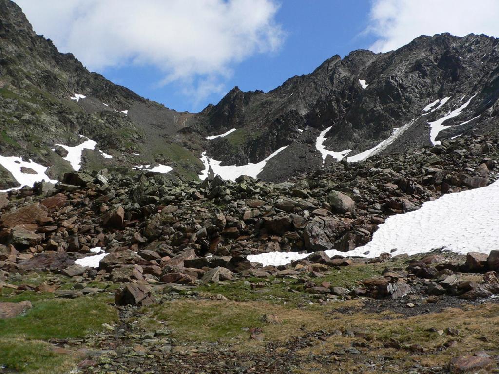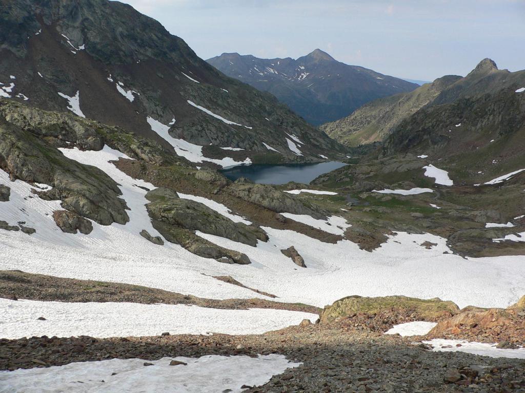 Cruzando algunos barrancos que desaguan en el Estany de Sotllo por el W, seguimos en la orilla derecha del barranco principal hasta el siguiente lago (Estany d’Estats 2465m). Un poco más arriba empezamos a encontrar los primeros neveros y pendientes un poco más pronunciadas caminos del collado (Puerto de Sotllo 2884m)