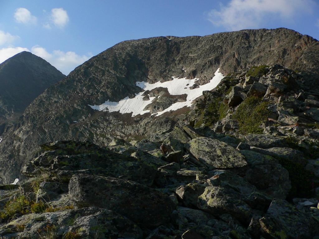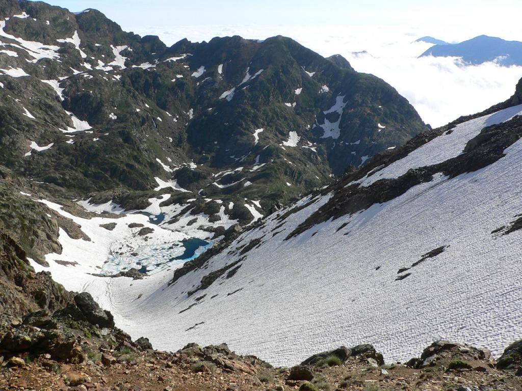 Desde aquí ya es visible el puerto, que alcanzamos por pedreras de pendientes un poco más duras, pero sin dificultad y prácticamente sin nieve (port de Canalbona o port de Riufret 2797m). El panorama del lado francés es bien distinto, con impresionantes neveros que caen hacia los lagos de Riufret.