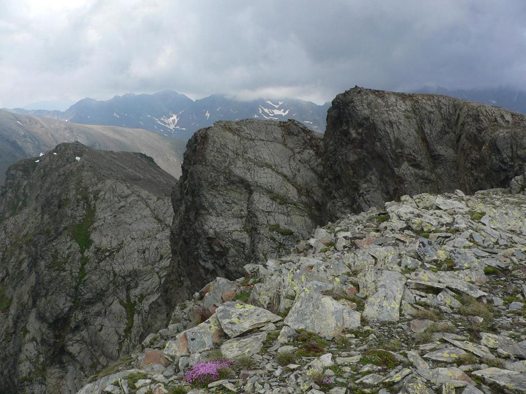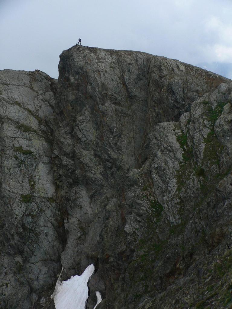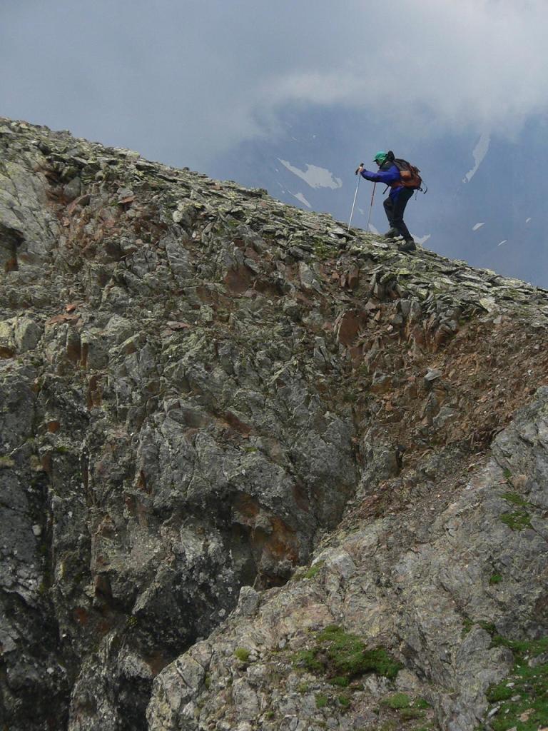 Con el cielo otra vez encapotado seguimos la cresta a la izquierda (N) hasta el pico Romaset (2837m) y un poco después hasta la punta Romaset (2841m). A nuestra izquierda (W, España) suaves lomas, y a nuestra derecha (E, Francia) impresionantes cortados que caen sobre los lagos de la Gardelle.