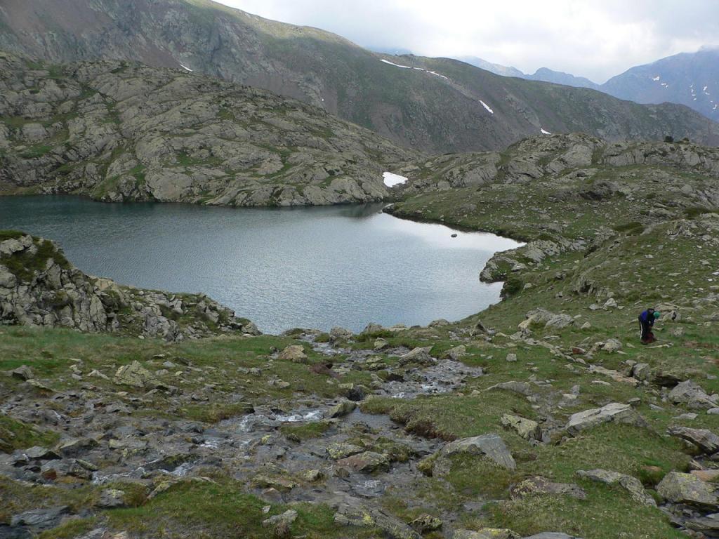 Continuamos porque ya conocemos el recorrido. Por suerte empieza a amainar, aunque el tiempo sigue inestable y con negros nubarrones. El punto más alto del recorrido es el falso collado a 2910m, donde se desvía la ruta hacia la Pica d’Estats y habíamos dejado las mochilas antes de ayer. Desde allí se desciende hacia los lagos de la Cometa d’Estats (Caumette d’Éstats 2800m) y se vuelve a ascender al puerto de Sotllo (Port de Sotllo 2893m). Una vez en e puerto volvemos a descender todo el valle hasta el refugio de Valferrera
