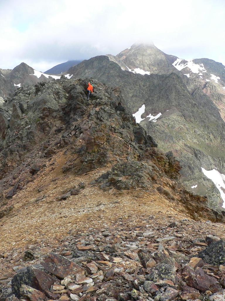 Hoy nos tomamos un día un poco más descansado subiendo una punta secundaria justo encima del refugio de Pinet. Es una ruta totalmente fuera de sendero por un corredor de hierba y piedra bastante empinado que nos lleva a la Pointe d’Escassa (Pointe d’Escassa 2476m). Desde aquí seguimos la cresta hacia el S, bordeando algún gendarme hasta la cota 2816, una arista que hay que hacer con cuidado pero sin dificultades destacables. Esta cota no tiene nombre en los mapas, así que la llamamos Punta Occidental de la Pointe de Montcalm. (La Pointe du Montcalm es una cima de 2940m. situada al norte del pico Montcalm) (Punta Occidental 2816m)
