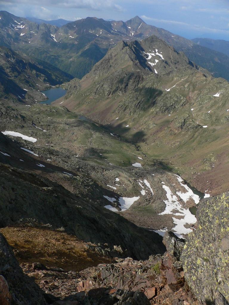 El tiempo es amenazante, con nubarrones muy negros de tormenta. Aquí nos equivocamos, ya que nos lanzamos hacia abajo hasta los lagos de la Cometa de Estats, cuando deberíamos haber girado hacia la derecha, rodeando el pico Verdaguer. Esto nos hace descender unos 60m más de lo necesario antes de comenzar la subida de nuevo en dirección al coll de Riufred. (Étangs de la Caumette d’Estats 2736m). Antes de llegar al coll, a 2900m., se gira a la derecha (S); allí dejamos las mochilas para hacer una ascensión rápida en vista del mal tiempo. Alcanzamos un colladito al E de la Pica (colladito 3039m), después el collado entre el Verdaguer y la Pica y, finalmente por roca de fácil trepada, la Pica (Pica d’Estats 3143m). Josan sube rápidamente al pic de Montcalm mientras yo desciendo tranquilamente hasta las mochilas.