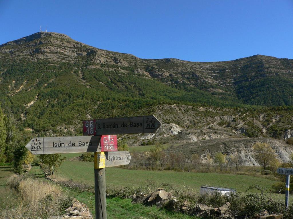 Cuando el relieve se vuelve más llano atravesamos una aldea (San Román de Basa 995m) donde entroncamos con el GR16 (sendero de gran recorrido que va de Biescas a Nocito), que nos llevará por campos y terrenos de margas hasta el coche.
