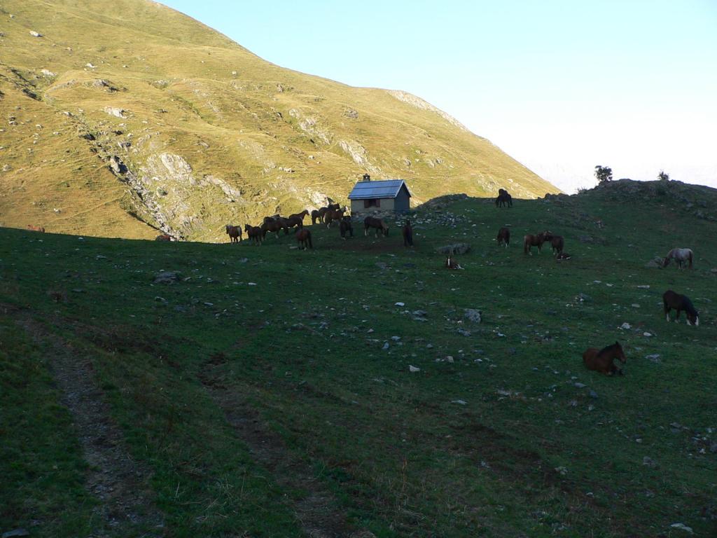 Por esta zona hay varias sendas, hay que mantener la orientación E, por una vaguadita a la derecha del barranco Aulot. A nuestra izquierda el barranco baja por un estrechamiento y nosotros subiremos por la derecha hasta llegar al Cuello Yenefrito (1790m 1h15′). Siguiendo hacia el E se alcanza pronto el refugio Yenefrito, bien mantenido y con muchas vacas y caballos en los alrededores (Refugio Yenefrito 1860m)