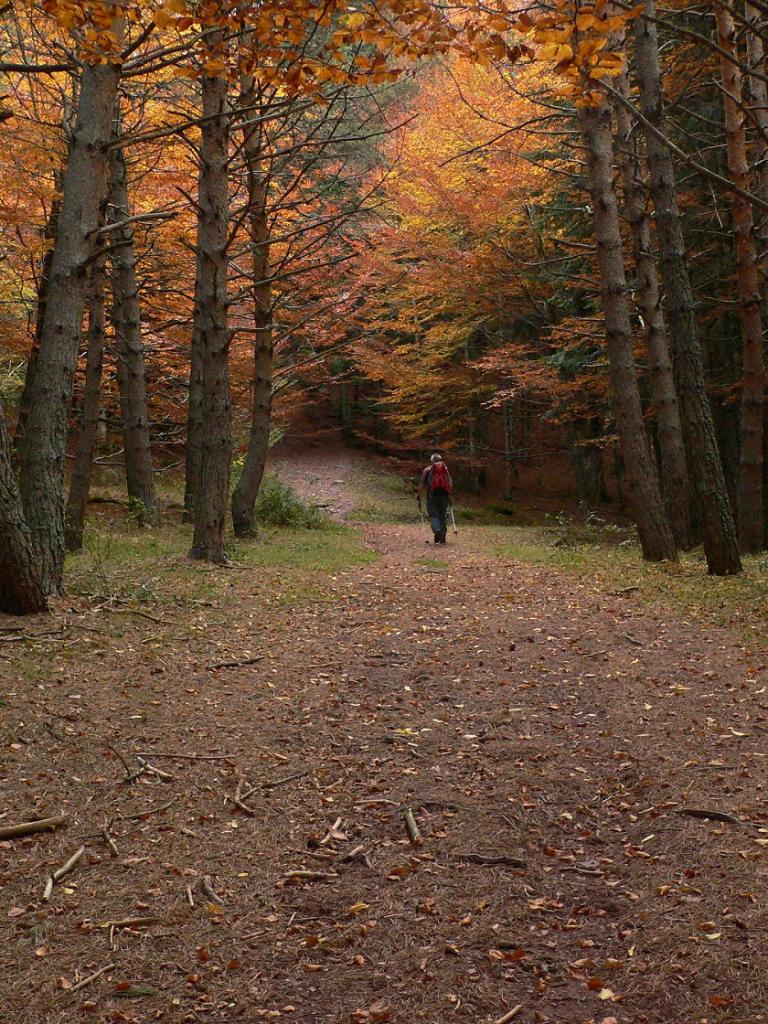 Cruzamos el puente por la carretera e inmediatamente sale un camino a la derecha que se introduce en el bosque y rodea el Campamento Ramiro el Monje por el S. El camino atraviesa un pista (1220m) y continua ascendiendo hacia el E por un lomo por encima de la orilla derecha del barranco Espata.