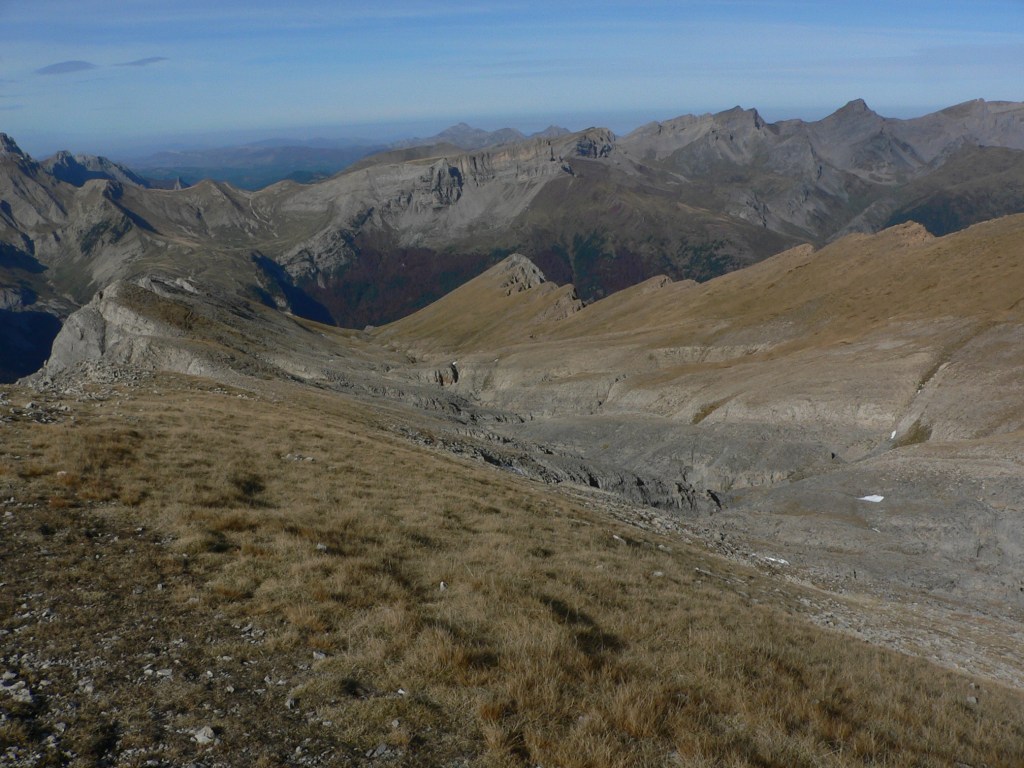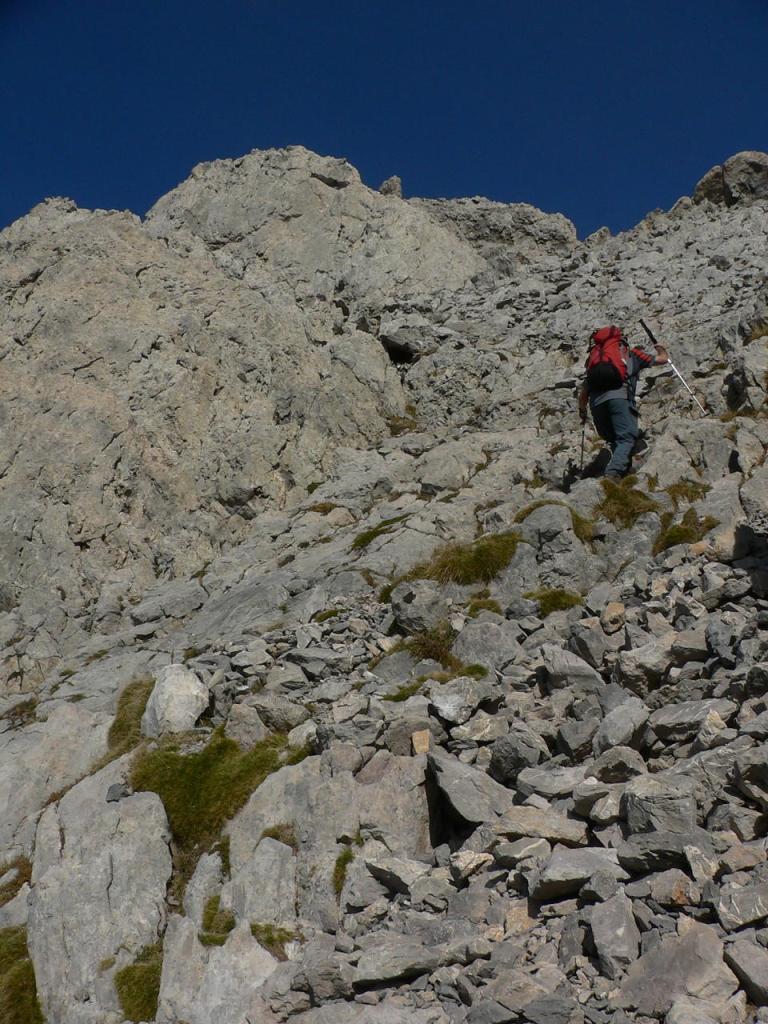 Giraremos hacia el N y luego otra vez hacia el E, buscando con la mirada el paso más evidente en la muralla S del Castillo, que parece una pared bastante homogénea. Pero a los 1950m habrá que tomar dirección NNE por la pedrera y enfilarse hacia dicho paso, que está entre dos pequeños promontorios de la muralla, justamente pegado al de la izquierda. La subida por la piedra caliza es un poco incómoda pero fácil, y en las paradas de descanso podemos tener estupendas vistas sobre todo a nuestra izquierda.
