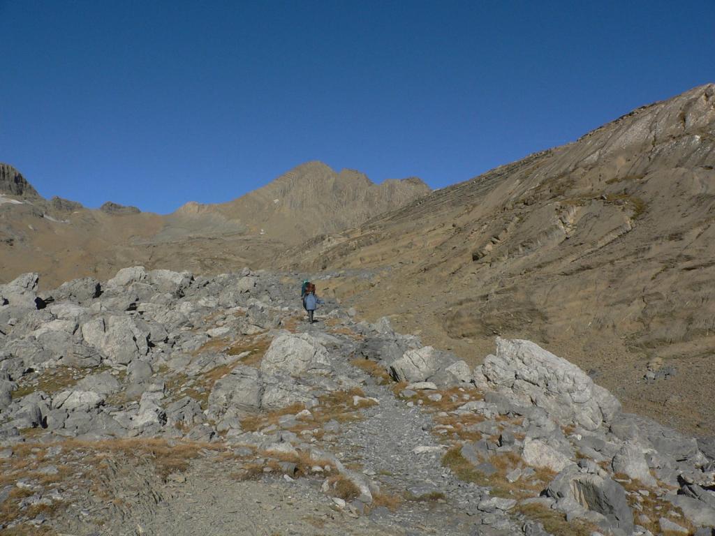 Continuamos en dirección NW hasta el desagüe del lago Marboré (2590m) por una zona de roca caliza, áspera y pelada, que será el paisaje que tendremos que recorrer hasta la cumbre. A la derecha, al otro lado del lago, la brecha de Tuca Roya, por la que se pasa al francés circo de Estaubé.