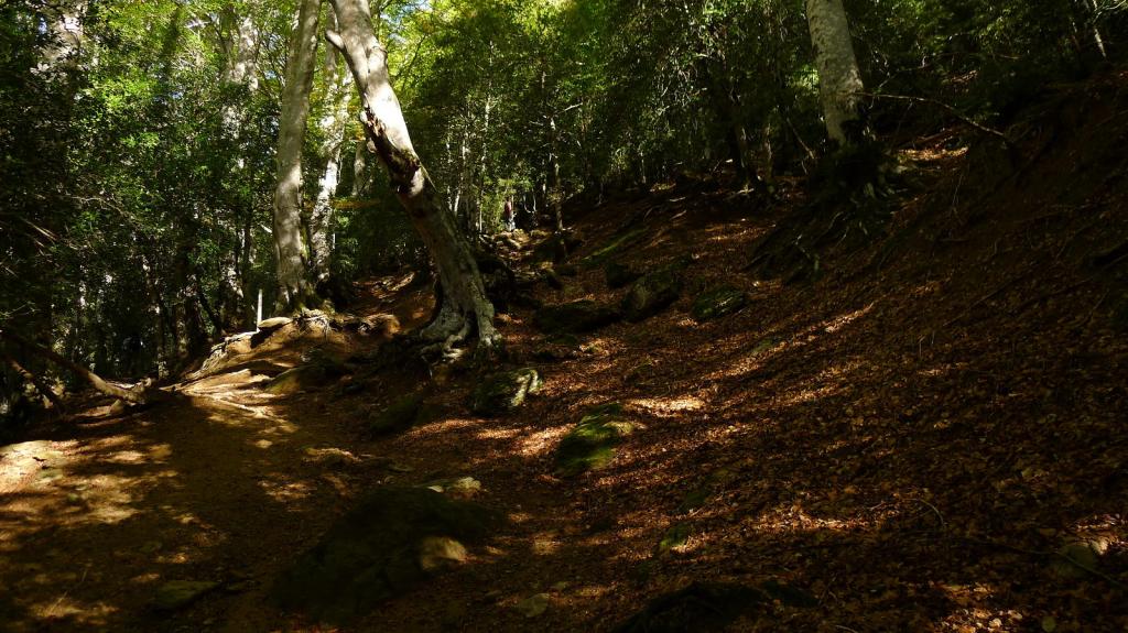 Habrá que retroceder unos metros por la carretera para tomar una senda a la derecha (en sentido subida) que se introduce en el bosque umbrío de hayas y abetos con el suelo tapizado de hojarasca (dirección NNW). Se gana altura por la pendiente ladera en la parte más dura del recorrido, hasta llegar a una pista (pista 1500m)