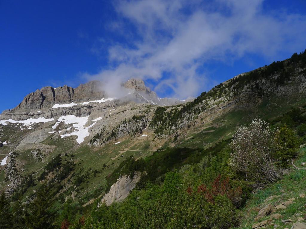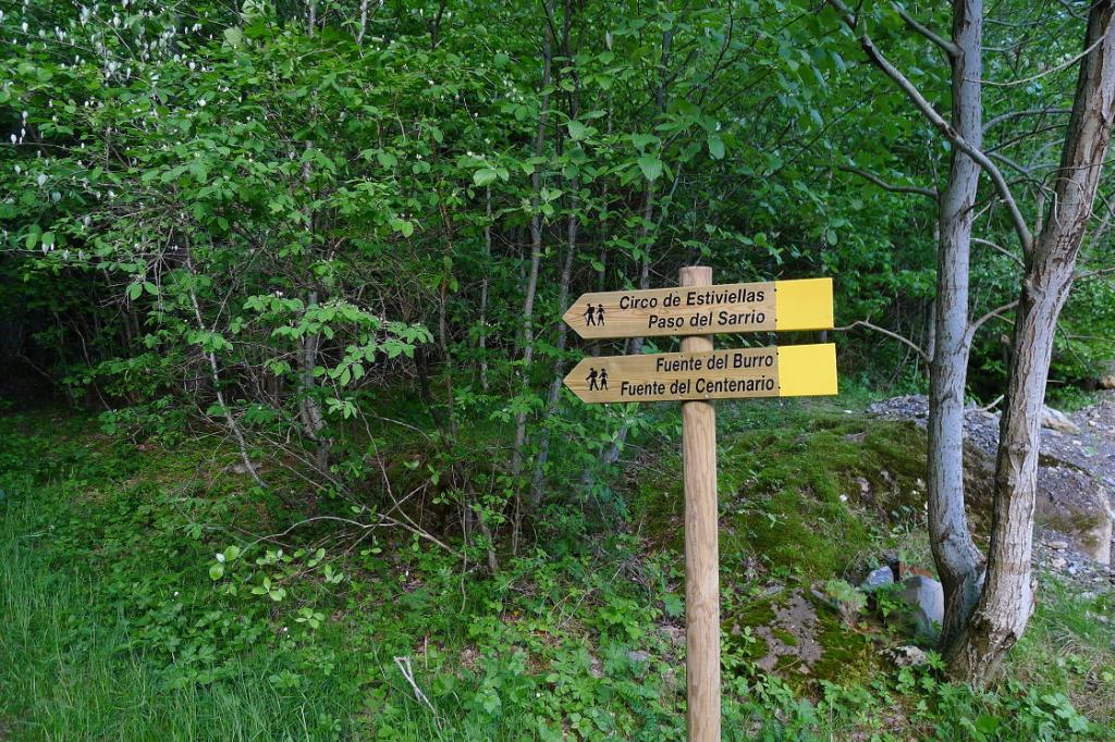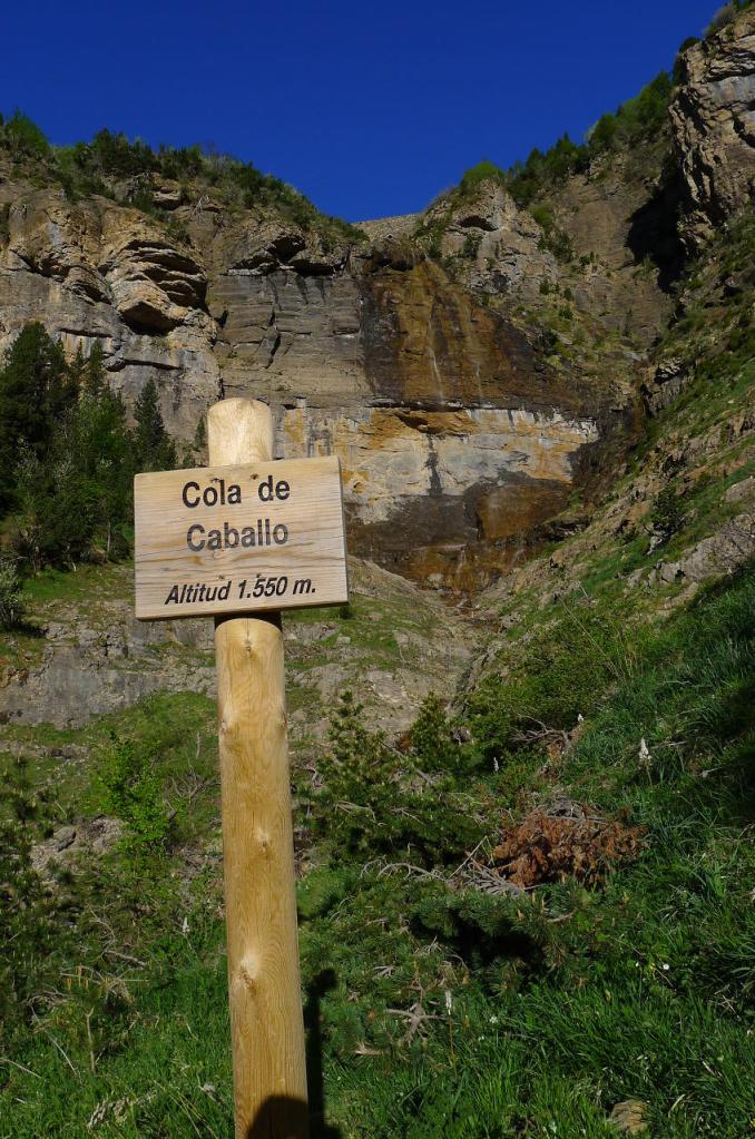 El sendero, siempre avanzando hacia el W, se introduce en el circo de Estiviella; el barranco está profundamente encajado a nuestra izquierda. Cuando se va saliendo a zona más abierta se puede ver la pared del circo y el salto de agua denominado Cola de Caballo.