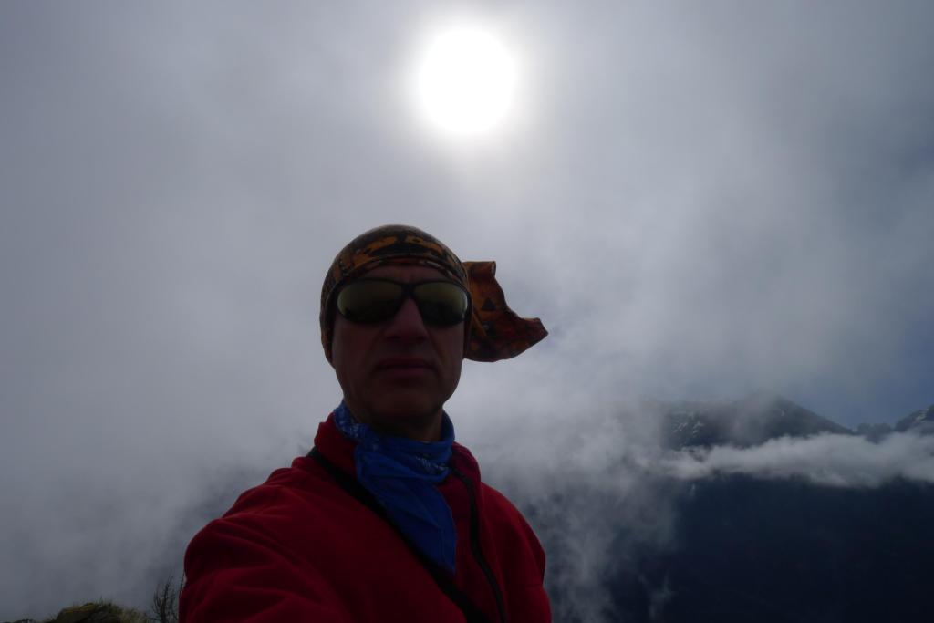 Según voy llegando a esta cresta se me echa encima el viento y la niebla procedentes de la vertiente del ibón de Tortiellas. Casi a ciegas y con muchísimo frío llego a la cima (Borreguil de la Cuca 2096m). Sin poder admirar las vistas, lo único que hago es abrigarme, hacer un par de fotos y bajar a un lugar resguardado para comer algo e iniciar el descenso a Canfranc.