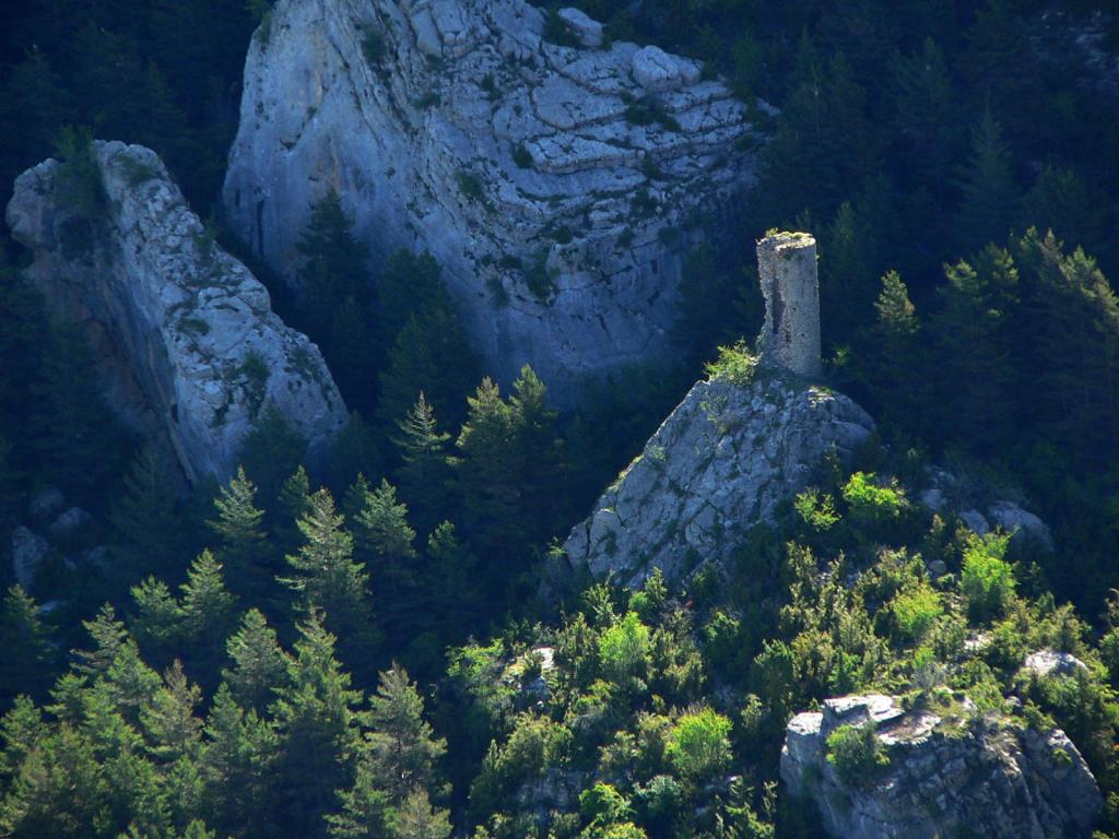 Desde la ermita ascendemos la loma de la izquierda (NW) alcanzando un primera cima: Montpedrós (1614m 2h07′) La vertiente E se desploma en un profundo barranco y en la ladera de enfrente se levanta, sobre una roca, la torre de Perauba
