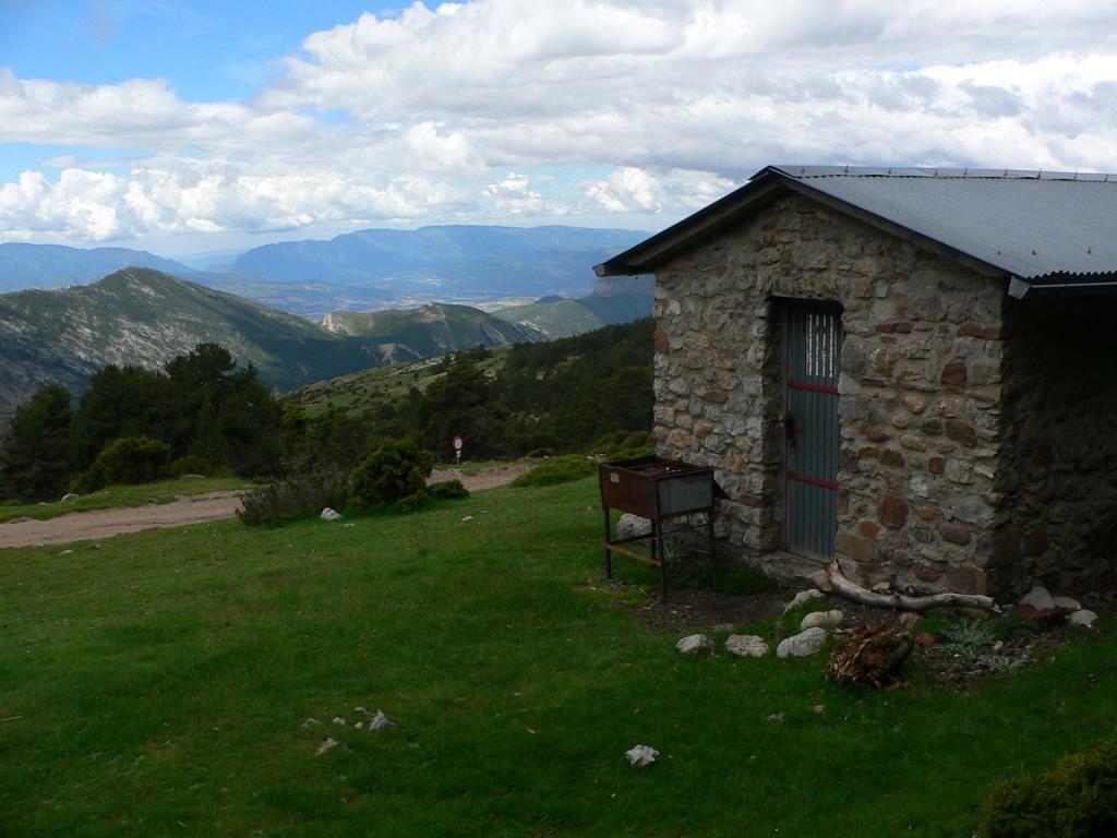 Poco a poco, nos vamos a la ladera S de esta sierra, pasando por una fuente (1710m 3h09′). La senda nos lleva a atravesar un pista donde se localiza un refugio (1885m 3h23′)