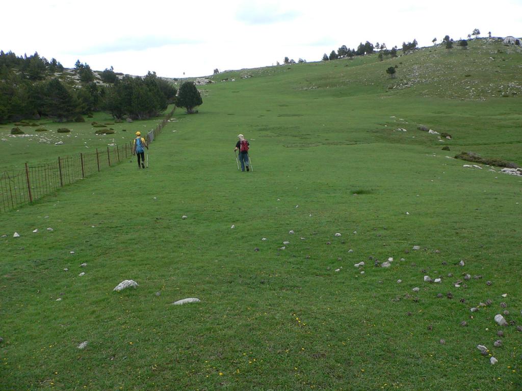 Descendemos por el mismo camino hasta un poquito después de la fuente, donde nos bifurcamos por una senda a la izquierda (bifurcación 1715m). Esta senda va girando al SW y conecta con una pista en un colladito llamado Lo Grau o Era del Comú (1505m 6h15′) .