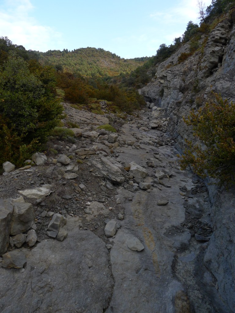 Dejando el barranco detrás de nosotros, avanzamos por la sierra Figuera hacia el N sobre la cota 1100m, y luego giramos un poco hacia el E, desembocando en un estrecho barranco seco, donde dejamos el PR 185 y ascendemos hacia el N por el lecho del barranco seco (desde 1107m hasta 1190m)