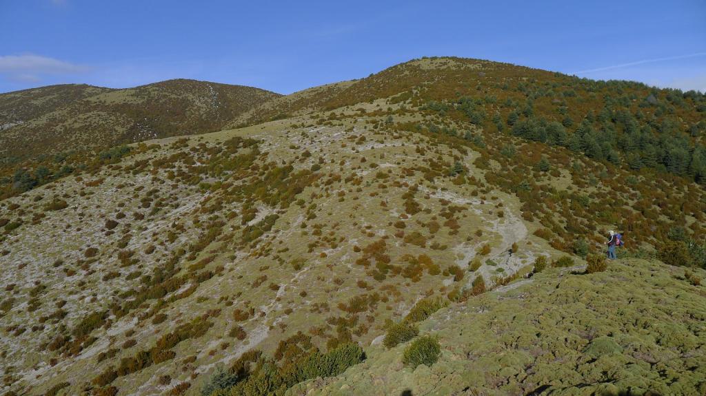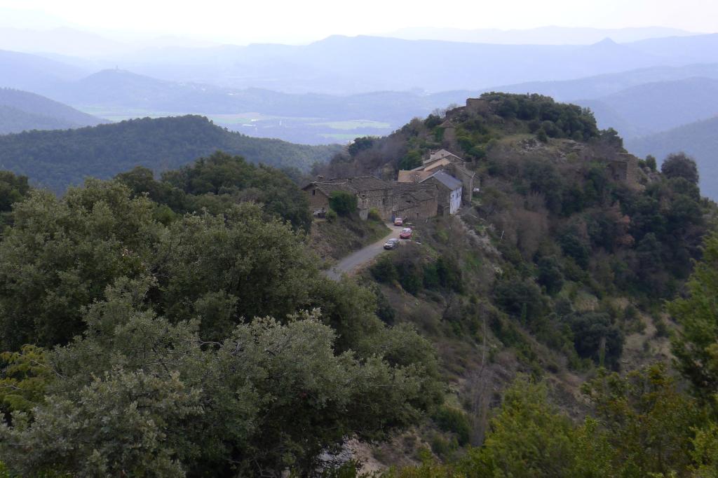 Descendemos directamente hacia el S, por una ladera de lajas de piedra y algo de vegetación, y vamos girando poco a poco hacia la izquierda hasta tomar dirección totalmente E. La bajada nos lleva directamente a la carretera a unos 250m del pueblo.