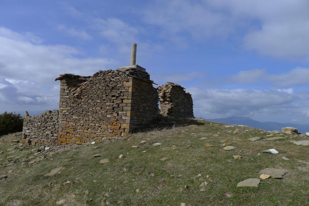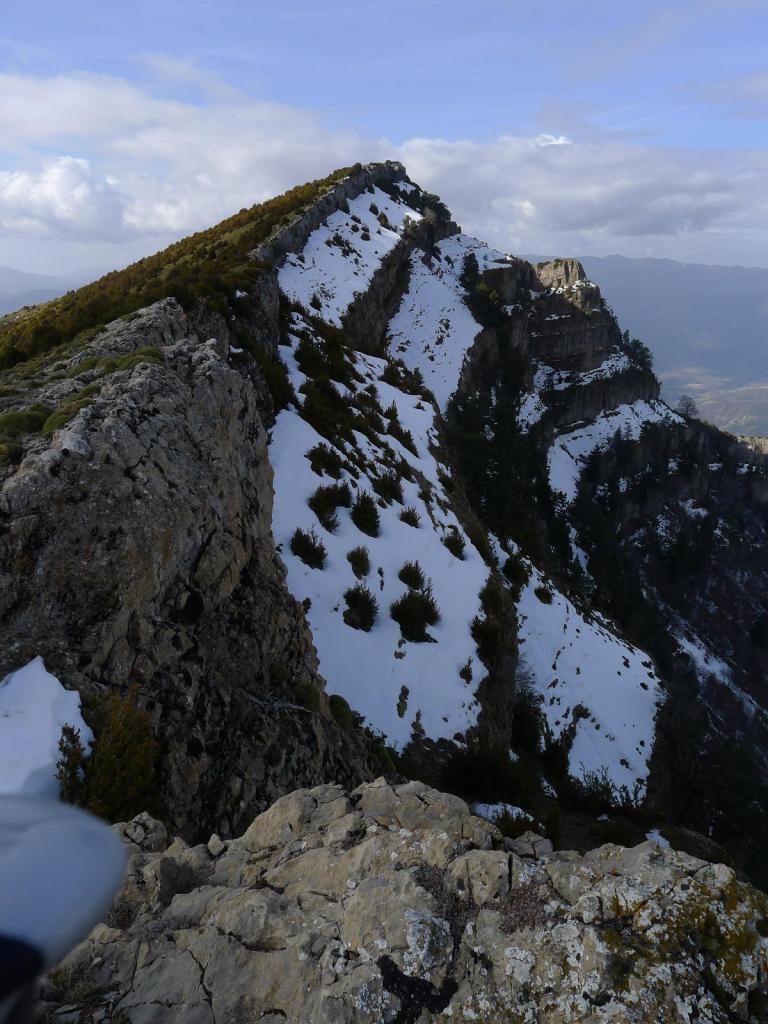 Ahora sólo hay que seguir el suave lomo de la divisoria hasta el Tozal de la Cruz (1729m) formado por dos cotas. Después de superar estas dos cotas intermedias la cresta gira al SSW siendo la ladera W, a nuestra derecha, muy escarpada, y todavía conservando nieve. La ladera E, en cambio, es siempre suave. En la cumbre están las ruinas de la ermita de Sta. Marina (1729m 3h15′) y el vértice geodésico.