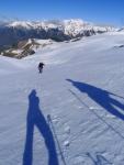 Hay que descender por la arista W de la Tuca de Pasolobino y, al llegar a los 2703m. (6h36′), descender por la pendiente ladera de nuestra izquierda (SW) que, sin nieve, no es demasiado complicada, pero ahora, con nieve y alguna roca, impone un poco y, a tramos, tenemos que bajar de cara a la ladera con crampones y piolet. Por suerte la nieve se asienta bien al hacer huella y, aunque sin descuidarse, da bastante seguridad.